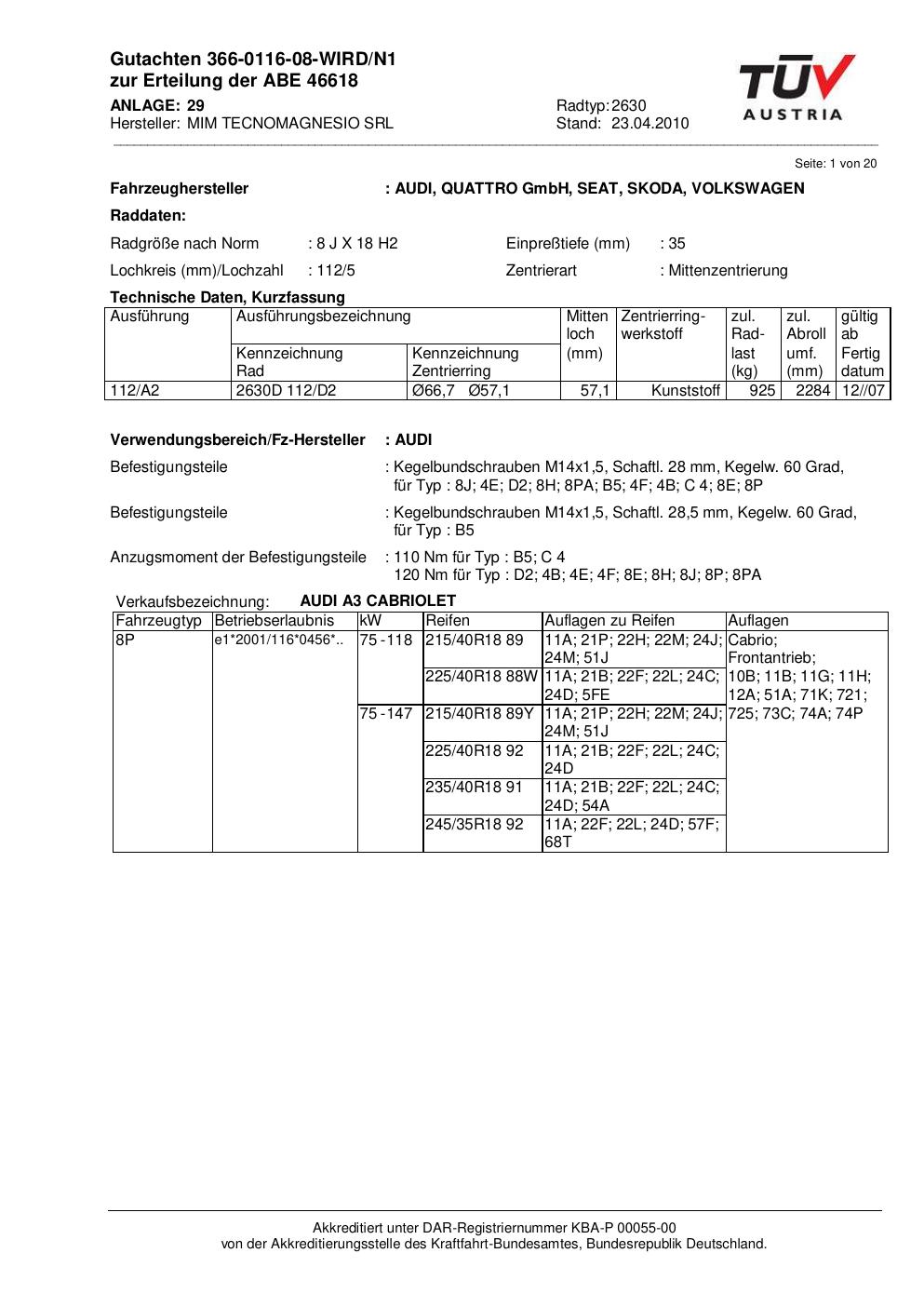 Diese Allgemeine Betriebserlaubnis (ABE) bezieht sich auf die Felge ATS 2630 in der Ausführung 8Jx18 ET0 mit der KBA 46618. Eine ABE ist eine bauartspezifische Genehmigung, die der Hersteller beim Kraftfahrt-Bundesamt (KBA) erwirkt hat. Sie erlaubt die Verwendung der Felge an den im Dokument genannten Fahrzeugen ohne zusätzliche Einzelabnahme, solange sämtliche im Gutachten aufgeführten Auflagen eingehalten werden.