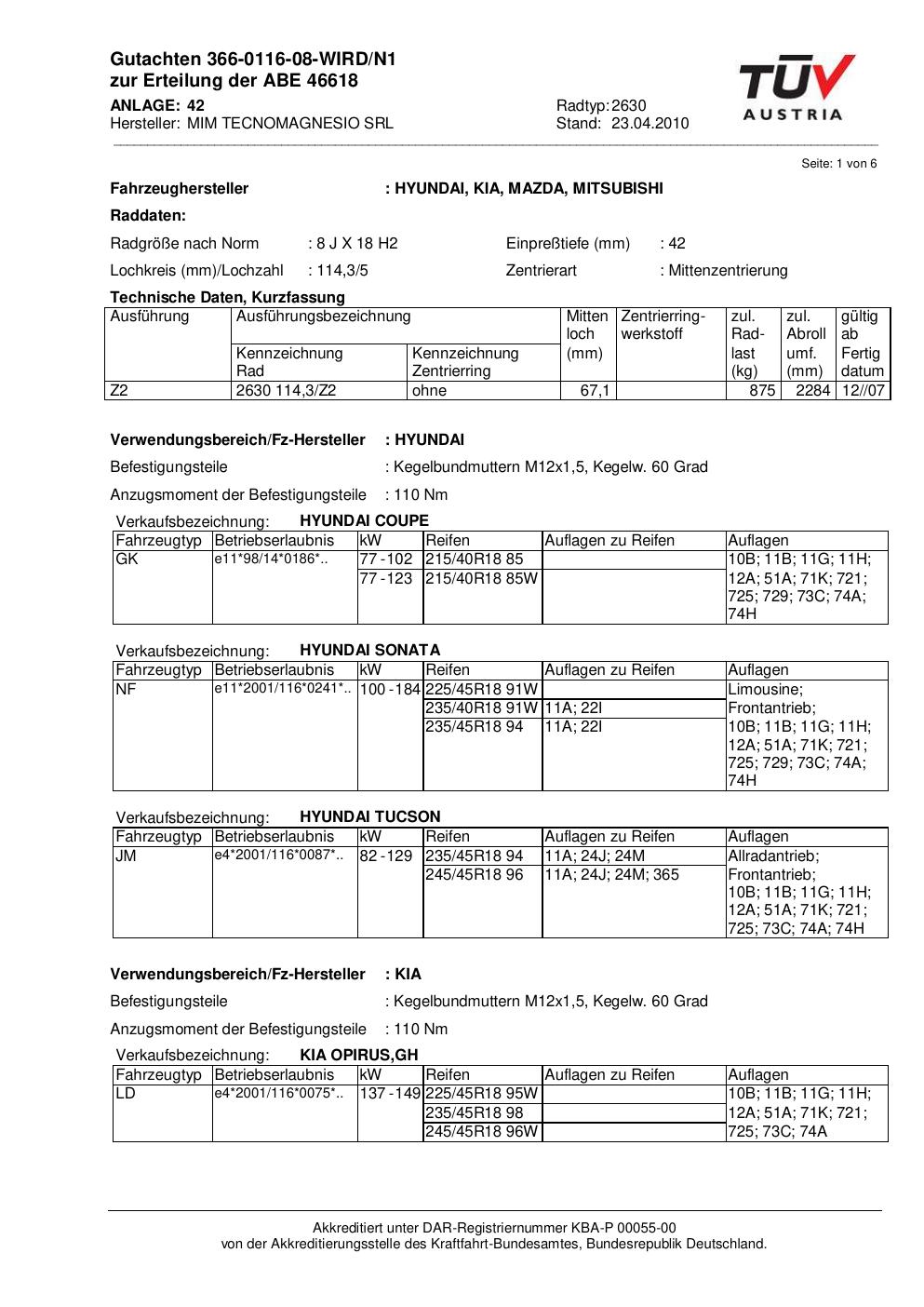 Dieses abe führt 4 Fahrzeugvarianten von 4 Fahrzeugherstellern als zulässig auf. Abgedeckt werden insbesondere Fahrzeuge von HYUNDAI, KIA, MAZDA, MITSUBISHI. Prüfe in der folgenden Liste, ob dein konkretes Fahrzeugmodell und – soweit angegeben – der passende Typ-Code (HSN/TSN-Variante) dabei ist. Der Typ-Code steht im Fahrzeugschein unter den Ziffern 2.1 und 2.2 – eine Schritt-für-Schritt-Anleitung dazu findest du im Wiki-Artikel zum Selbst-Prüfen des Gutachtens.