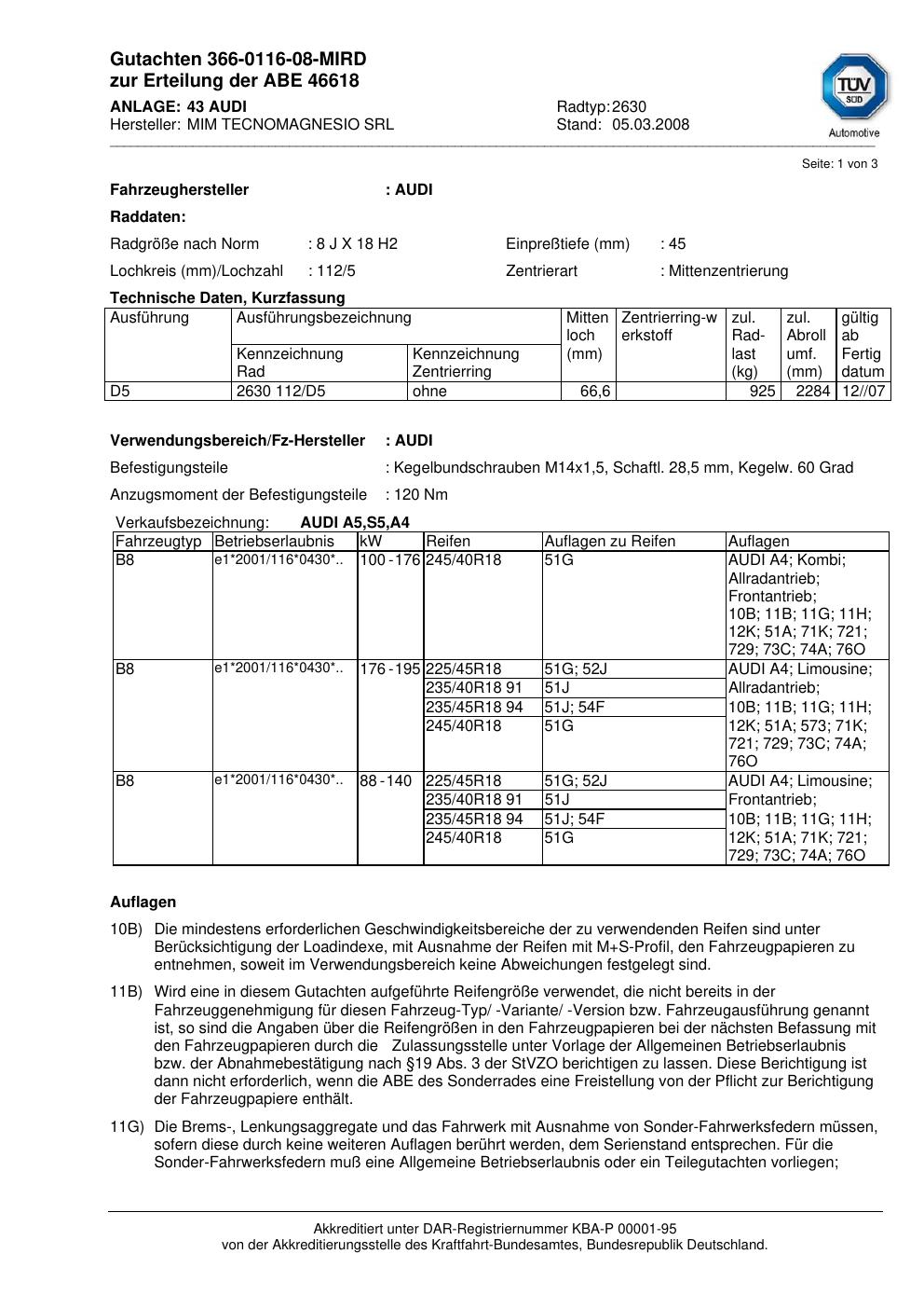 Dieses abe führt 1 Fahrzeugvariante von 1 Fahrzeughersteller als zulässig auf. Abgedeckt werden insbesondere Fahrzeuge von AUDI. Prüfe in der folgenden Liste, ob dein konkretes Fahrzeugmodell und – soweit angegeben – der passende Typ-Code (HSN/TSN-Variante) dabei ist. Der Typ-Code steht im Fahrzeugschein unter den Ziffern 2.1 und 2.2 – eine Schritt-für-Schritt-Anleitung dazu findest du im Wiki-Artikel zum Selbst-Prüfen des Gutachtens.