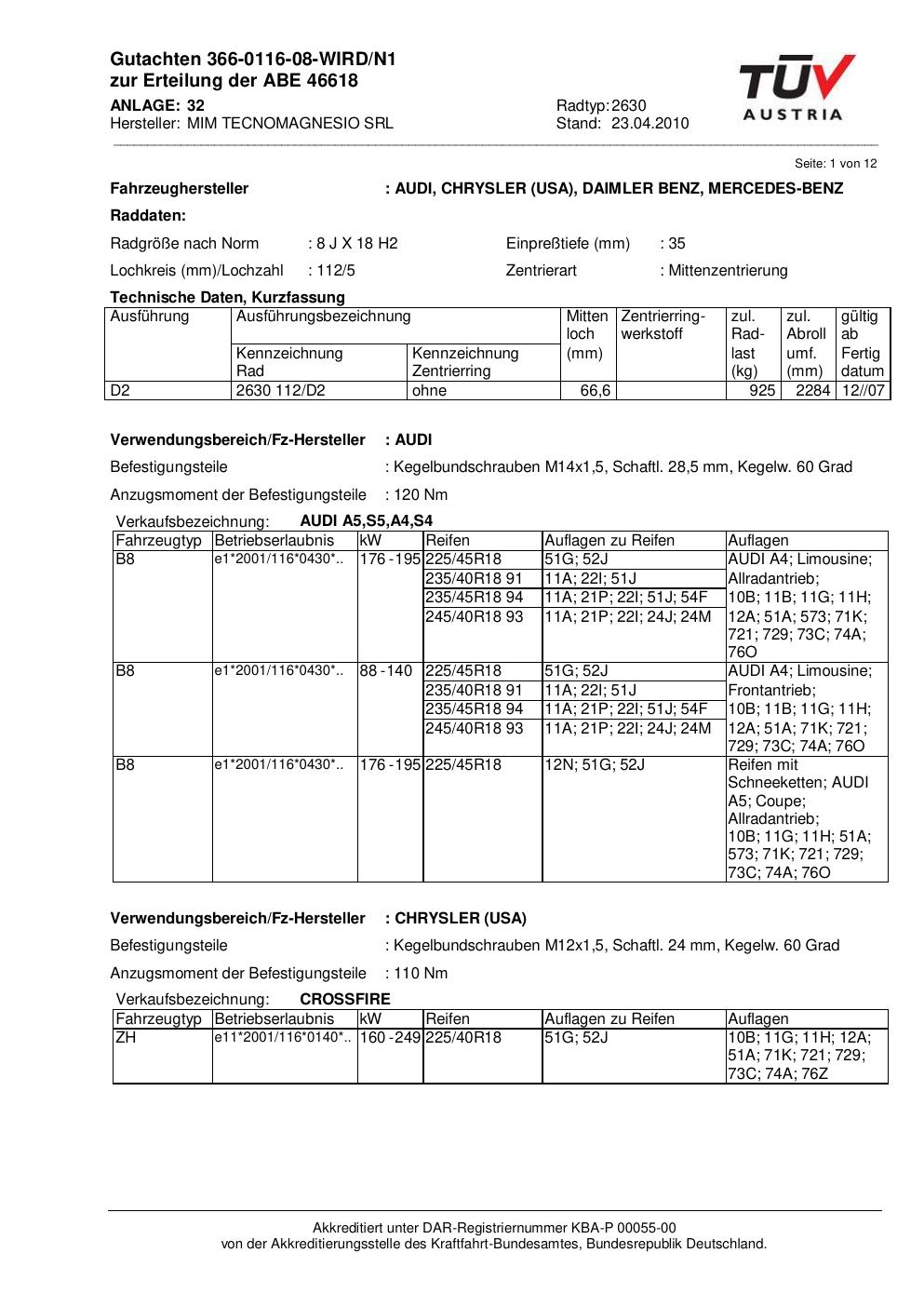 Dieses abe führt 4 Fahrzeugvarianten von 4 Fahrzeugherstellern als zulässig auf. Abgedeckt werden insbesondere Fahrzeuge von AUDI, CHRYSLER, DAIMLER, MERCEDES-BENZ. Prüfe in der folgenden Liste, ob dein konkretes Fahrzeugmodell und – soweit angegeben – der passende Typ-Code (HSN/TSN-Variante) dabei ist. Der Typ-Code steht im Fahrzeugschein unter den Ziffern 2.1 und 2.2 – eine Schritt-für-Schritt-Anleitung dazu findest du im Wiki-Artikel zum Selbst-Prüfen des Gutachtens.