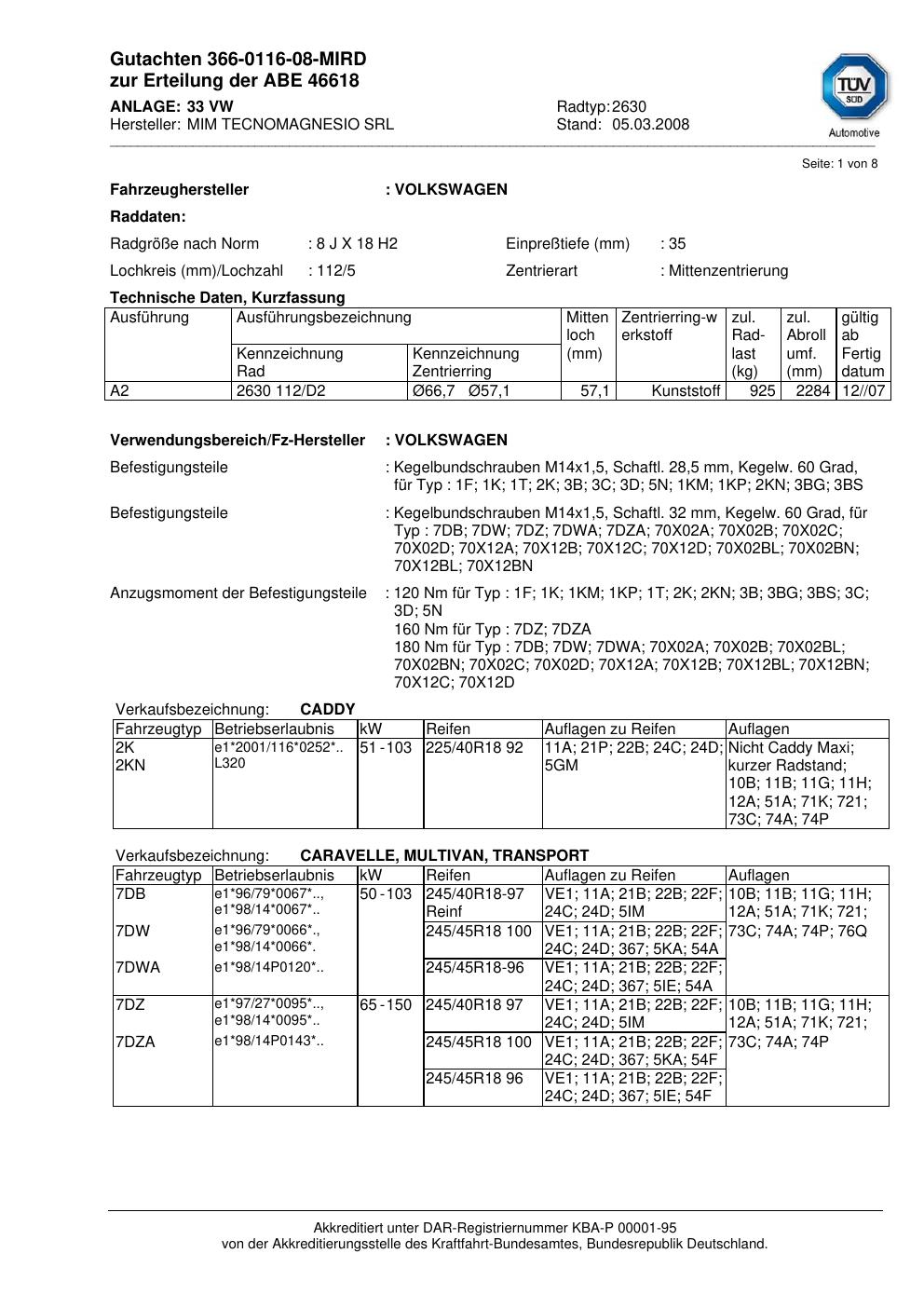 Dieses abe führt 2 Fahrzeugvarianten von 2 Fahrzeugherstellern als zulässig auf. Abgedeckt werden insbesondere Fahrzeuge von VOLKSWAGEN, VW. Prüfe in der folgenden Liste, ob dein konkretes Fahrzeugmodell und – soweit angegeben – der passende Typ-Code (HSN/TSN-Variante) dabei ist. Der Typ-Code steht im Fahrzeugschein unter den Ziffern 2.1 und 2.2 – eine Schritt-für-Schritt-Anleitung dazu findest du im Wiki-Artikel zum Selbst-Prüfen des Gutachtens.