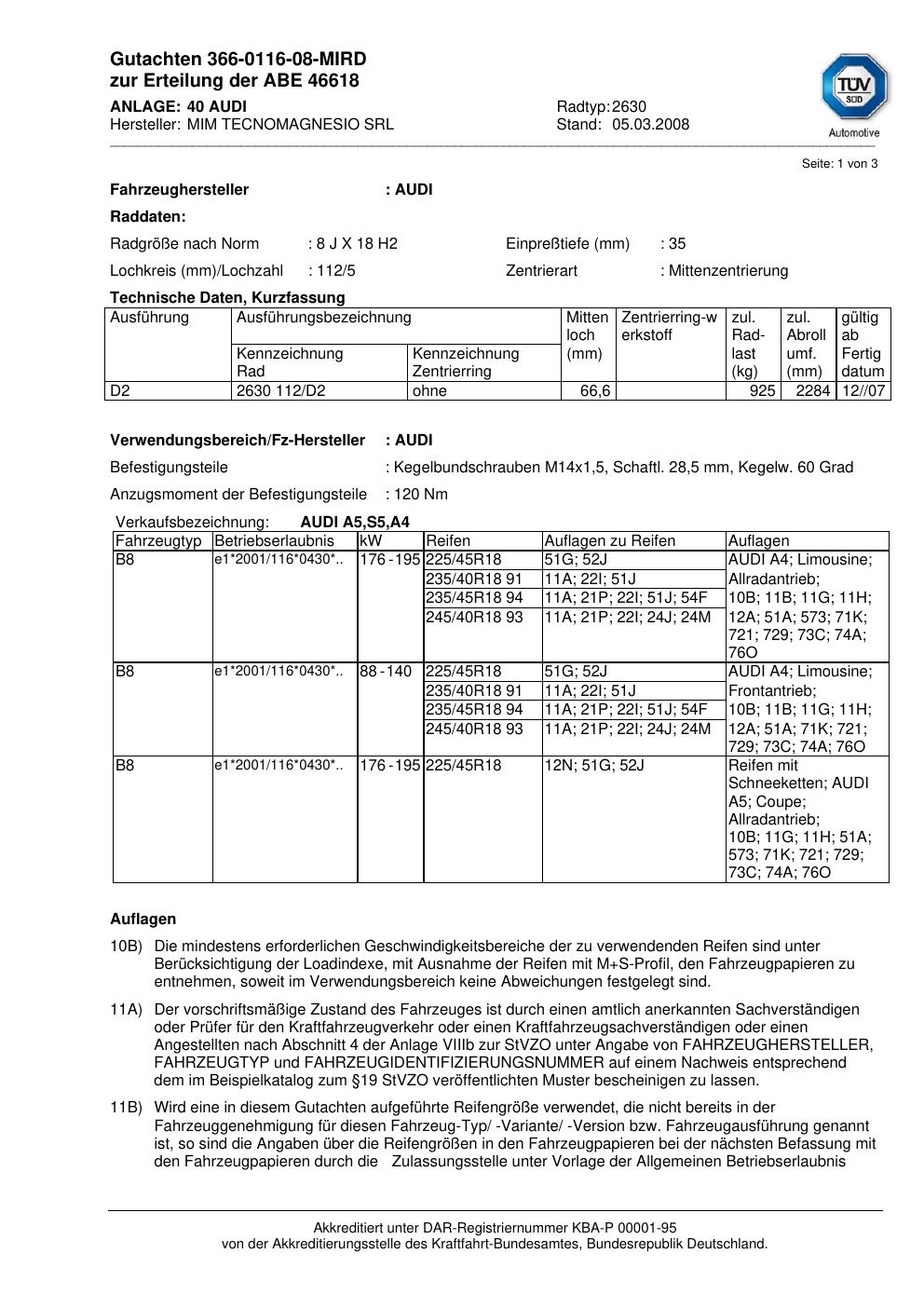 Dieses abe führt 1 Fahrzeugvariante von 1 Fahrzeughersteller als zulässig auf. Abgedeckt werden insbesondere Fahrzeuge von AUDI. Prüfe in der folgenden Liste, ob dein konkretes Fahrzeugmodell und – soweit angegeben – der passende Typ-Code (HSN/TSN-Variante) dabei ist. Der Typ-Code steht im Fahrzeugschein unter den Ziffern 2.1 und 2.2 – eine Schritt-für-Schritt-Anleitung dazu findest du im Wiki-Artikel zum Selbst-Prüfen des Gutachtens.