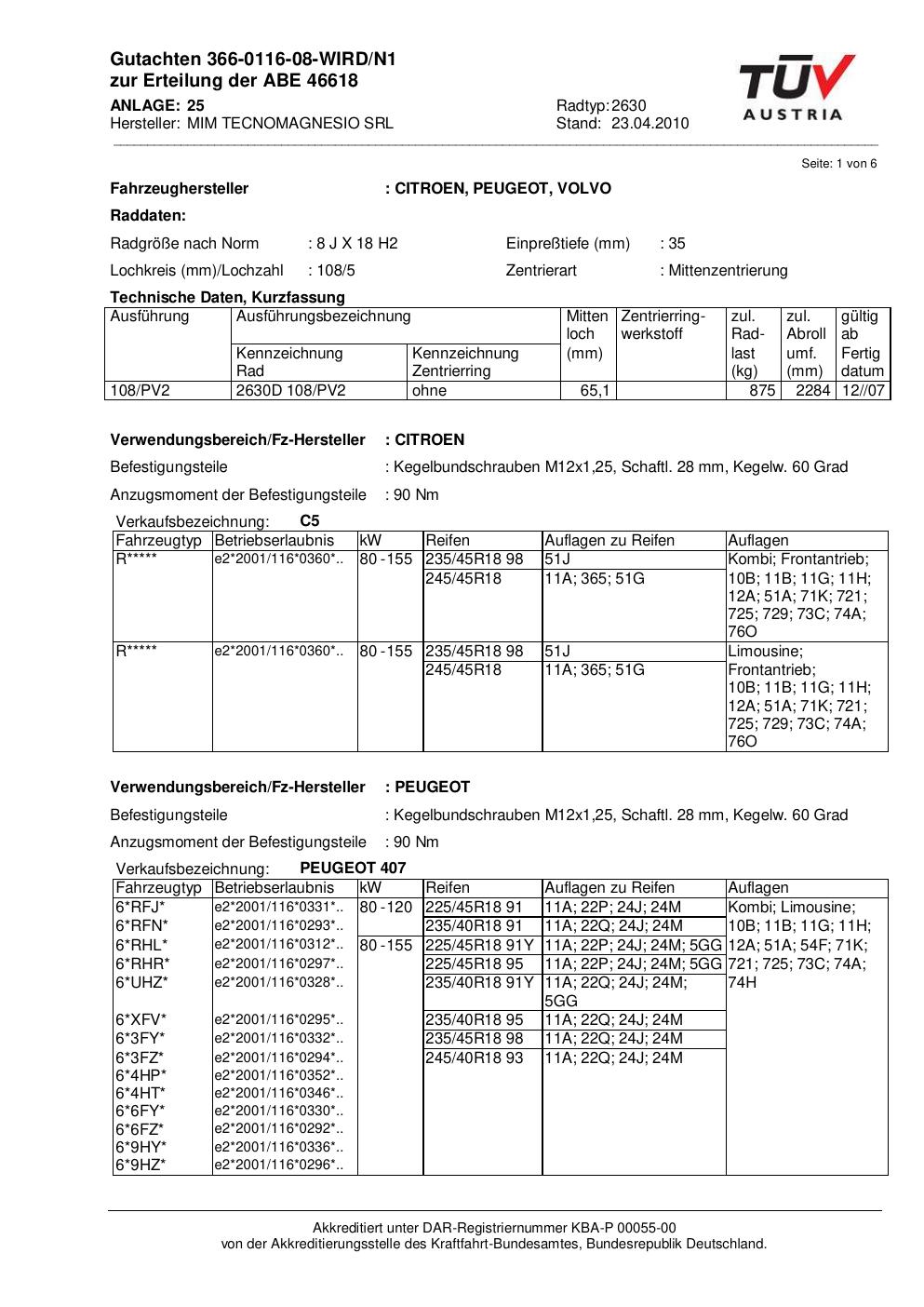 Dieses abe führt 3 Fahrzeugvarianten von 3 Fahrzeugherstellern als zulässig auf. Abgedeckt werden insbesondere Fahrzeuge von CITROEN, PEUGEOT, VOLVO. Prüfe in der folgenden Liste, ob dein konkretes Fahrzeugmodell und – soweit angegeben – der passende Typ-Code (HSN/TSN-Variante) dabei ist. Der Typ-Code steht im Fahrzeugschein unter den Ziffern 2.1 und 2.2 – eine Schritt-für-Schritt-Anleitung dazu findest du im Wiki-Artikel zum Selbst-Prüfen des Gutachtens.