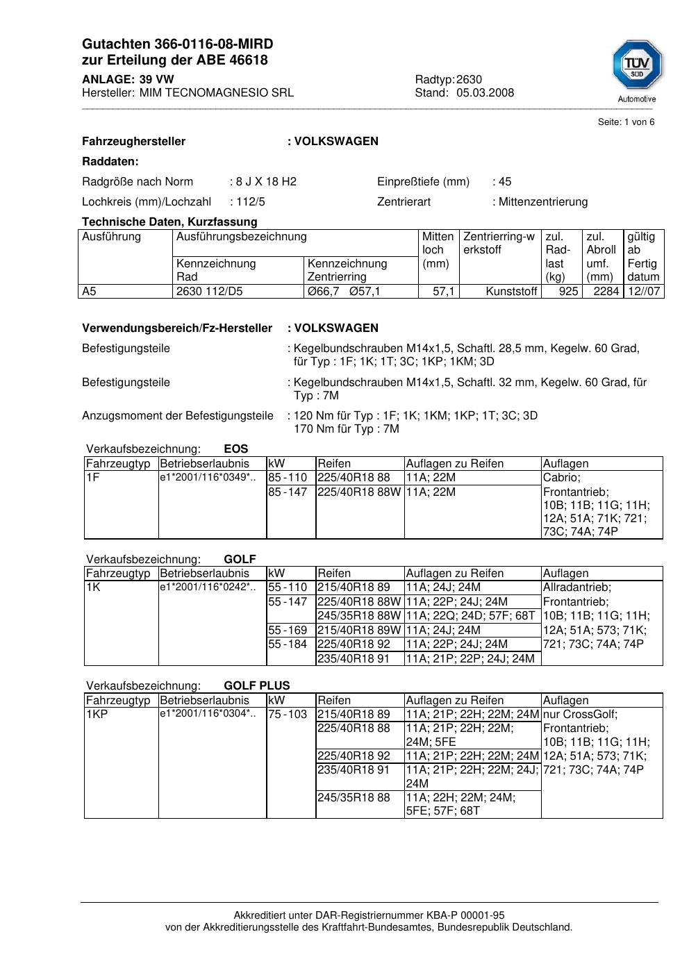 Dieses abe führt 2 Fahrzeugvarianten von 2 Fahrzeugherstellern als zulässig auf. Abgedeckt werden insbesondere Fahrzeuge von VOLKSWAGEN, VW. Prüfe in der folgenden Liste, ob dein konkretes Fahrzeugmodell und – soweit angegeben – der passende Typ-Code (HSN/TSN-Variante) dabei ist. Der Typ-Code steht im Fahrzeugschein unter den Ziffern 2.1 und 2.2 – eine Schritt-für-Schritt-Anleitung dazu findest du im Wiki-Artikel zum Selbst-Prüfen des Gutachtens.