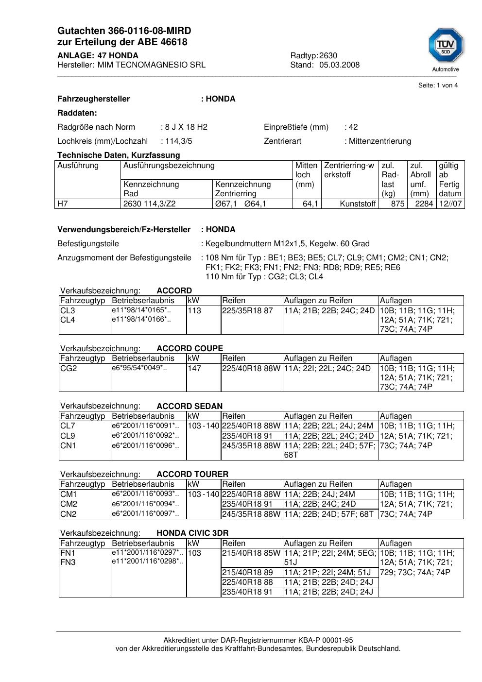 Dieses abe führt 1 Fahrzeugvariante von 1 Fahrzeughersteller als zulässig auf. Abgedeckt werden insbesondere Fahrzeuge von HONDA. Prüfe in der folgenden Liste, ob dein konkretes Fahrzeugmodell und – soweit angegeben – der passende Typ-Code (HSN/TSN-Variante) dabei ist. Der Typ-Code steht im Fahrzeugschein unter den Ziffern 2.1 und 2.2 – eine Schritt-für-Schritt-Anleitung dazu findest du im Wiki-Artikel zum Selbst-Prüfen des Gutachtens.