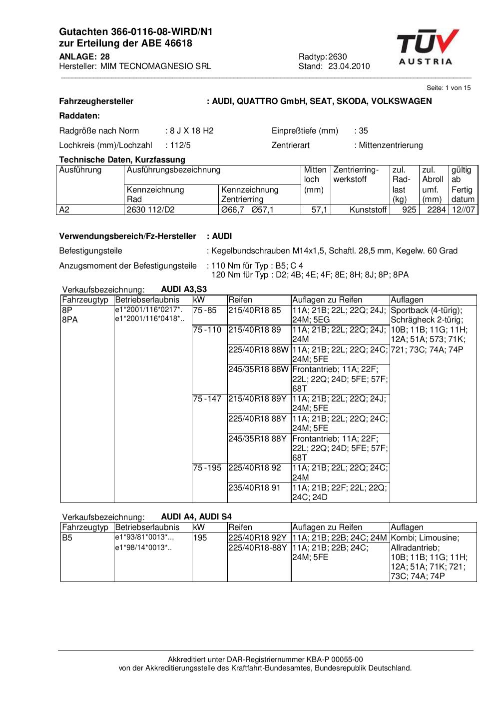 Die vollständige und rechtsverbindliche Fahrzeugliste mit allen Auflagen und Einschränkungen steht im PDF-Dokument. Nicht jede Fahrzeug-Kombination erlaubt alle Reifengrößen oder Tieferlegungen – die Details entscheiden bei der Abnahme.