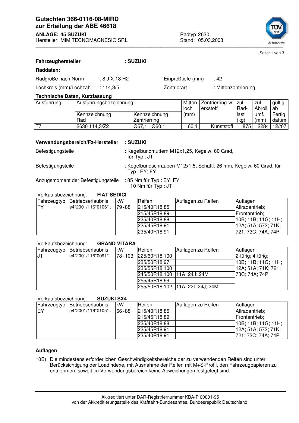 Dieses abe führt 2 Fahrzeugvarianten von 2 Fahrzeugherstellern als zulässig auf. Abgedeckt werden insbesondere Fahrzeuge von FIAT, SUZUKI. Prüfe in der folgenden Liste, ob dein konkretes Fahrzeugmodell und – soweit angegeben – der passende Typ-Code (HSN/TSN-Variante) dabei ist. Der Typ-Code steht im Fahrzeugschein unter den Ziffern 2.1 und 2.2 – eine Schritt-für-Schritt-Anleitung dazu findest du im Wiki-Artikel zum Selbst-Prüfen des Gutachtens.