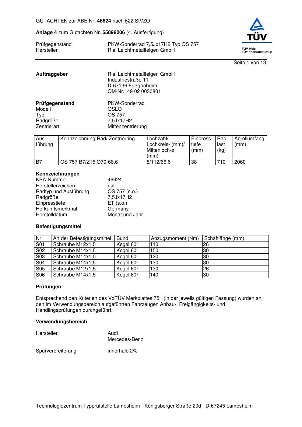 Dieses Gutachten (abe) bezieht sich auf die Alufelge brand-rial OS 757 in der Ausführung 7.5Jx17 ET 0, Mittenloch 0 mm (KBA 46624). Im PDF findest du typischerweise zulässige Reifengrößen, Auflagen/Anbauhinweise und – je nach Dokument – Hinweise zur Eintragung.