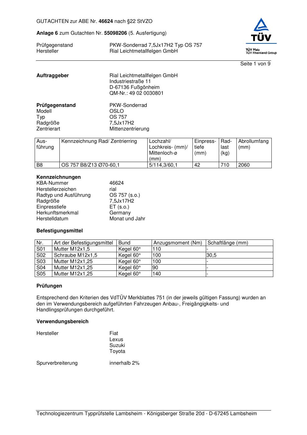 Dieses Gutachten (abe) bezieht sich auf die Alufelge brand-rial OS 757 in der Ausführung 7.5Jx17 ET 0, Mittenloch 0 mm (KBA 46624). Im PDF findest du typischerweise zulässige Reifengrößen, Auflagen/Anbauhinweise und – je nach Dokument – Hinweise zur Eintragung.
