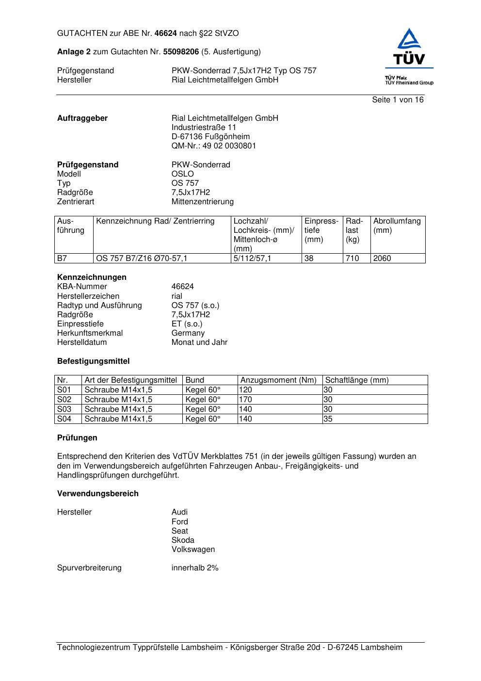 Dieses Gutachten (abe) bezieht sich auf die Alufelge brand-rial OS 757 in der Ausführung 7.5Jx17 ET 0, Mittenloch 0 mm (KBA 46624). Im PDF findest du typischerweise zulässige Reifengrößen, Auflagen/Anbauhinweise und – je nach Dokument – Hinweise zur Eintragung.