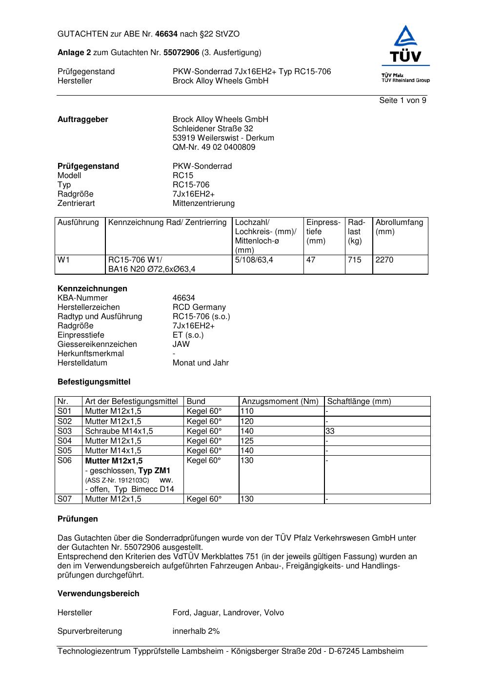 Dieses Gutachten (abe) bezieht sich auf die Alufelge Brock RC15-706 in der Ausführung ET 0, Mittenloch 0 mm (KBA 46634). Im PDF findest du typischerweise zulässige Reifengrößen, Auflagen/Anbauhinweise und – je nach Dokument – Hinweise zur Eintragung.