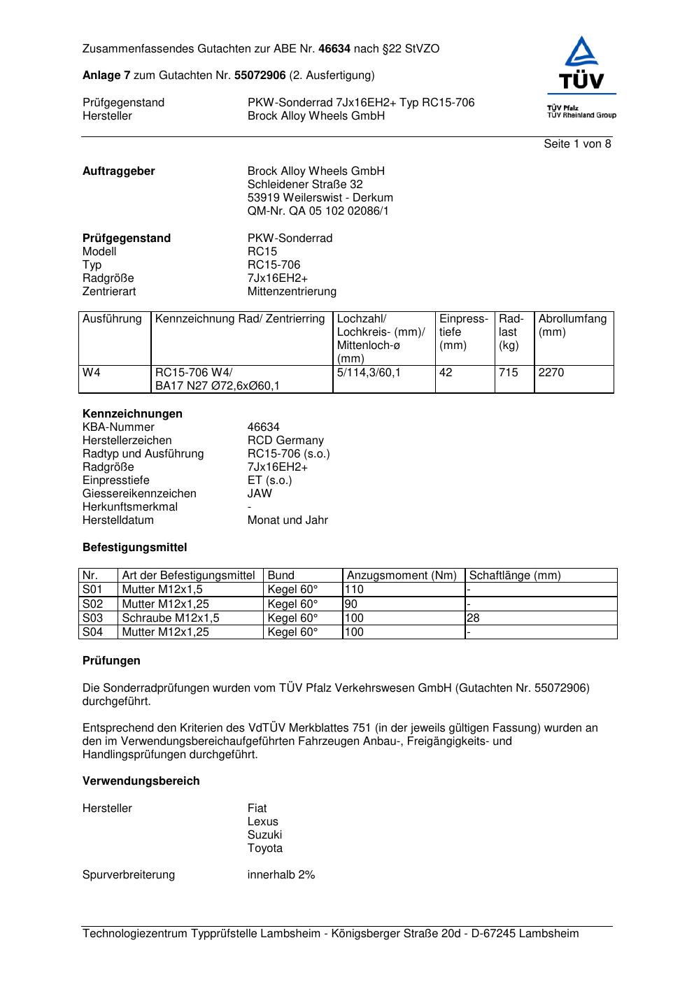 Dieses Gutachten (abe) bezieht sich auf die Alufelge Brock RC15-706 in der Ausführung ET 0, Mittenloch 0 mm (KBA 46634). Im PDF findest du typischerweise zulässige Reifengrößen, Auflagen/Anbauhinweise und – je nach Dokument – Hinweise zur Eintragung.