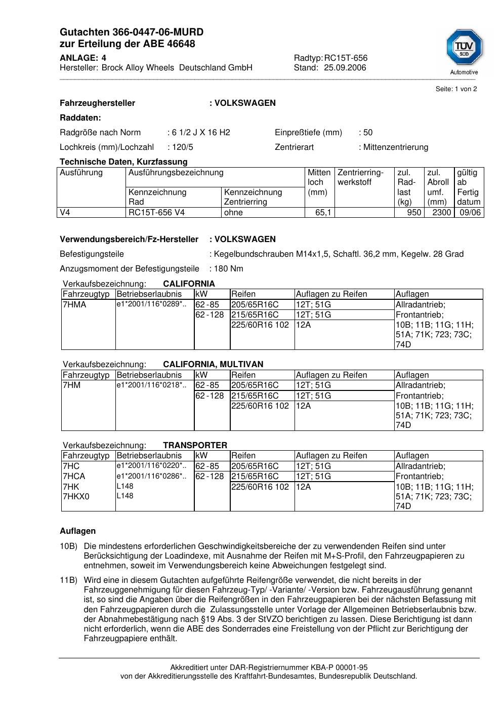 Dieses Gutachten (abe) bezieht sich auf die Alufelge Brock RC15T-656 in der Ausführung 2Jx16 ET 0, Mittenloch 0 mm (KBA 46648). Im PDF findest du typischerweise zulässige Reifengrößen, Auflagen/Anbauhinweise und – je nach Dokument – Hinweise zur Eintragung.