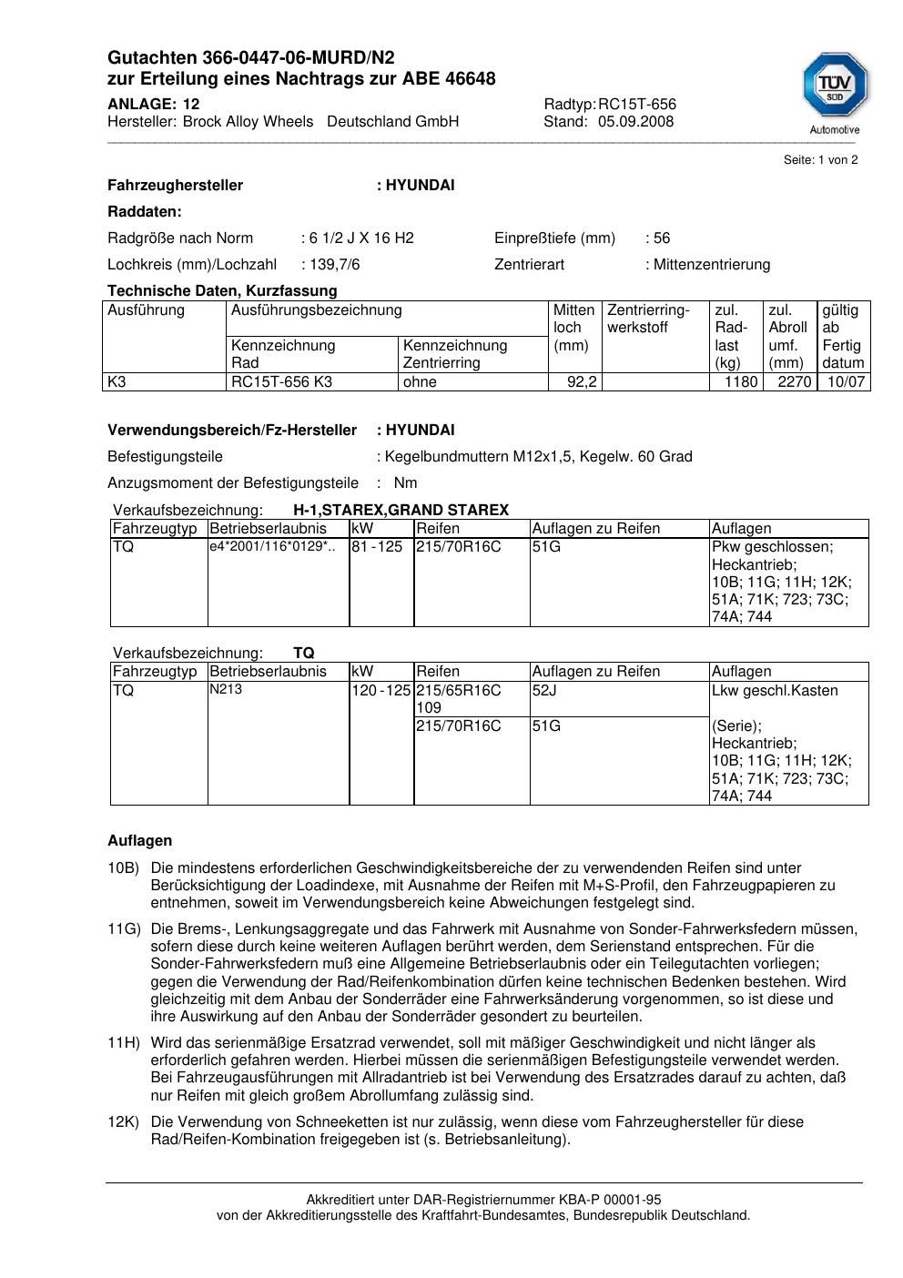Dieses Gutachten (abe) bezieht sich auf die Alufelge Brock RC15T-656 in der Ausführung 2Jx16 ET 0, Mittenloch 0 mm (KBA 46648). Im PDF findest du typischerweise zulässige Reifengrößen, Auflagen/Anbauhinweise und – je nach Dokument – Hinweise zur Eintragung.