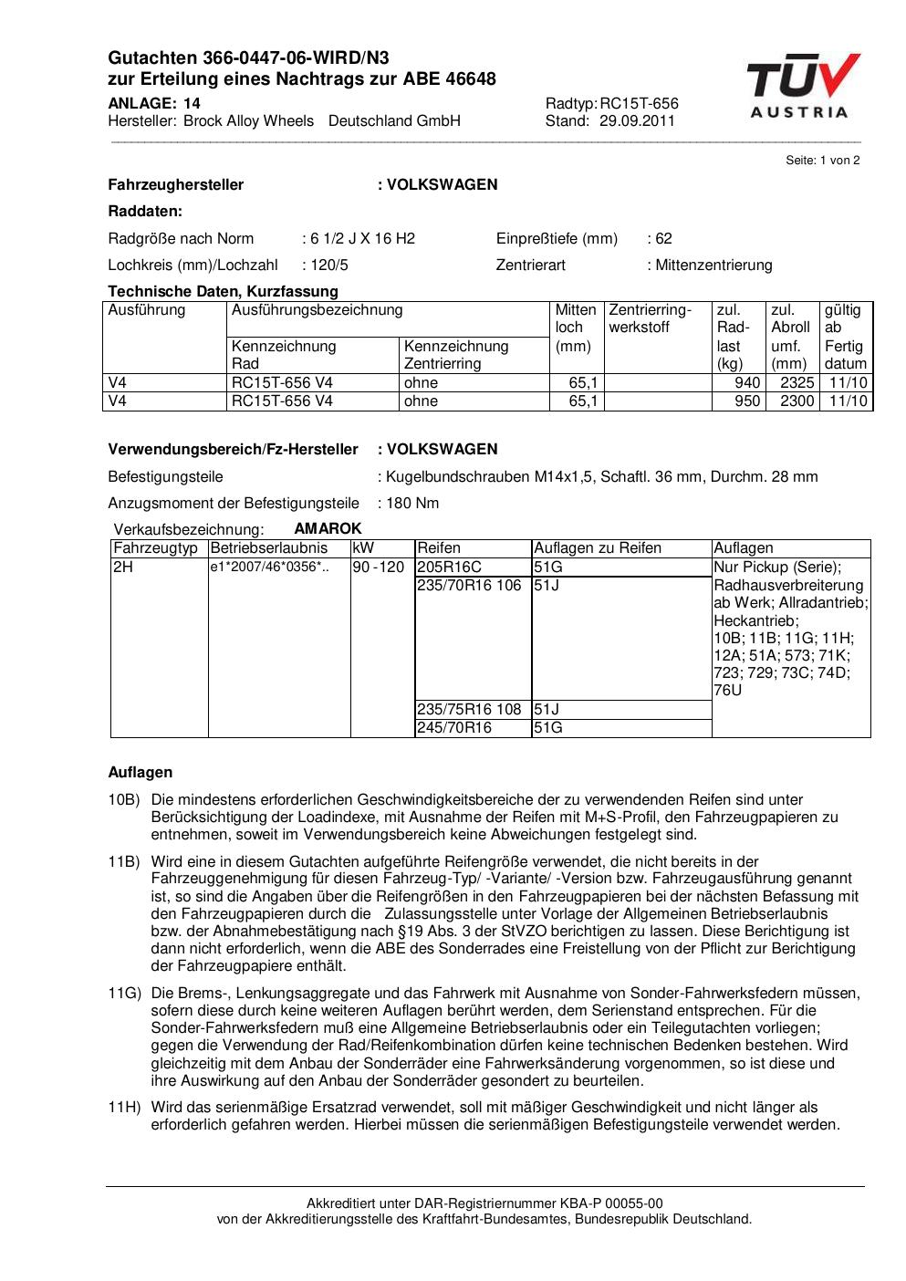 Dieses Gutachten (abe) bezieht sich auf die Alufelge Brock RC15T -656 in der Ausführung 2Jx16 ET 0, Mittenloch 0 mm (KBA 46648). Im PDF findest du typischerweise zulässige Reifengrößen, Auflagen/Anbauhinweise und – je nach Dokument – Hinweise zur Eintragung.
