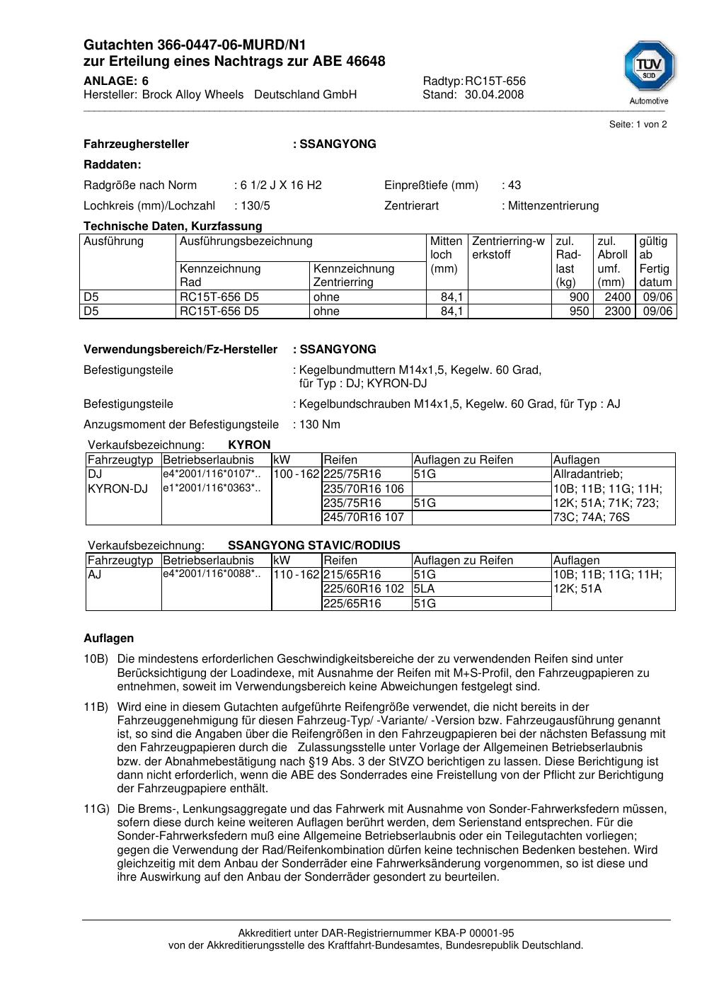 Dieses Gutachten (abe) bezieht sich auf die Alufelge Brock RC15T-656 in der Ausführung 2Jx16 ET 0, Mittenloch 0 mm (KBA 46648). Im PDF findest du typischerweise zulässige Reifengrößen, Auflagen/Anbauhinweise und – je nach Dokument – Hinweise zur Eintragung.