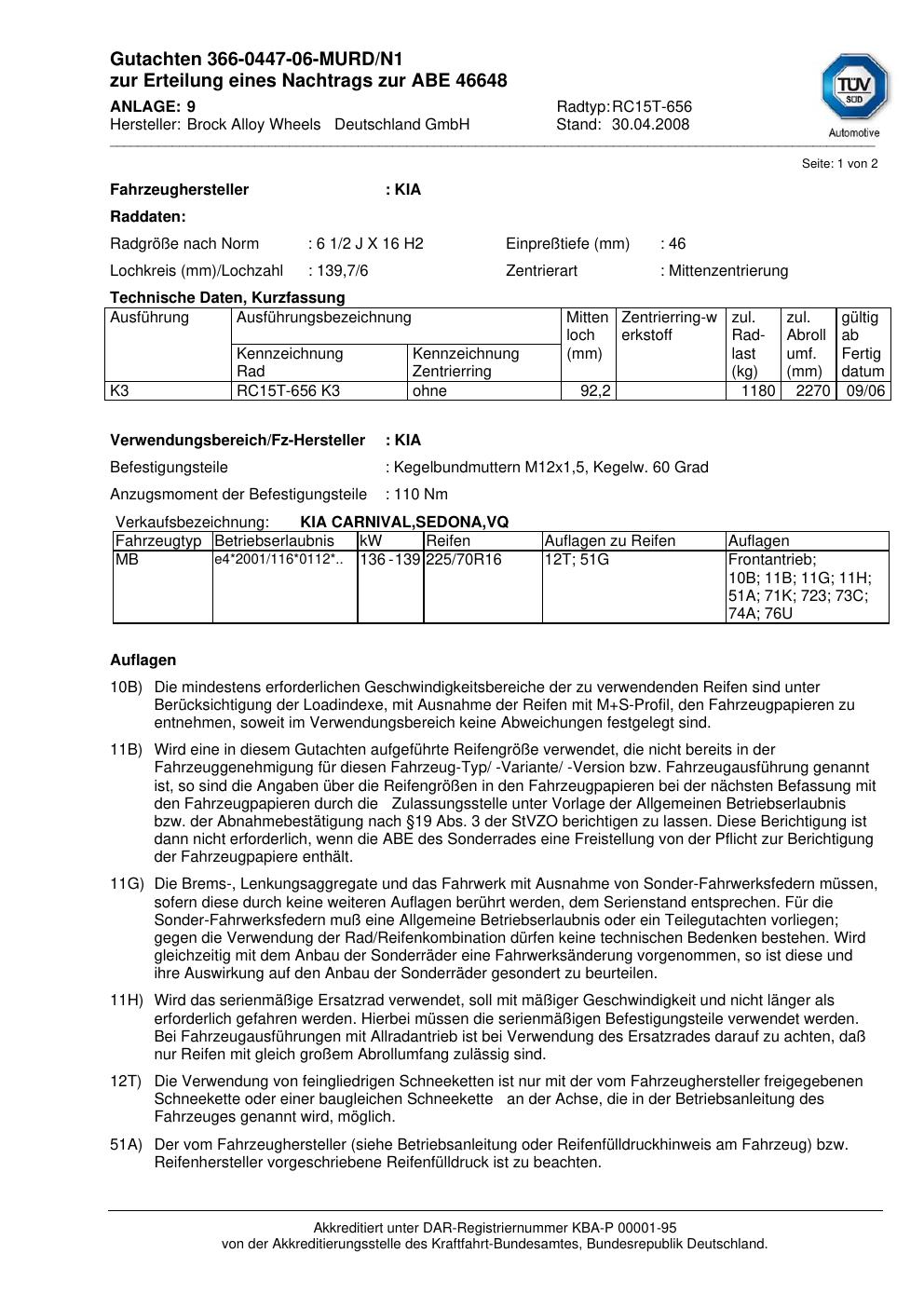 Dieses Gutachten (abe) bezieht sich auf die Alufelge Brock RC15T-656 in der Ausführung 2Jx16 ET 0, Mittenloch 0 mm (KBA 46648). Im PDF findest du typischerweise zulässige Reifengrößen, Auflagen/Anbauhinweise und – je nach Dokument – Hinweise zur Eintragung.