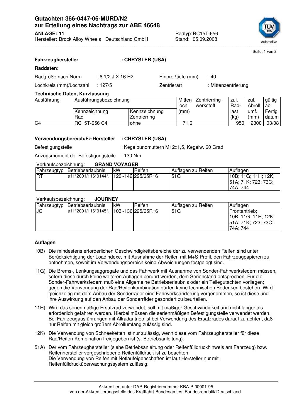 Dieses Gutachten (abe) bezieht sich auf die Alufelge Brock RC15T-656 in der Ausführung 2Jx16 ET 0, Mittenloch 0 mm (KBA 46648). Im PDF findest du typischerweise zulässige Reifengrößen, Auflagen/Anbauhinweise und – je nach Dokument – Hinweise zur Eintragung.