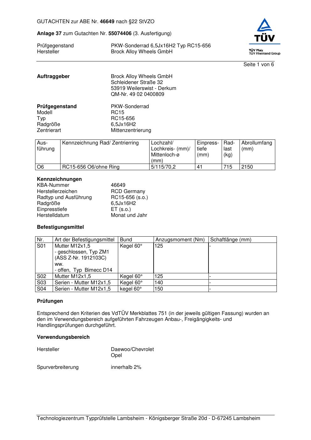 Dieses Gutachten (abe) bezieht sich auf die Alufelge Brock RC15-656 in der Ausführung 6.5Jx16 ET 0, Mittenloch 0 mm (KBA 46649). Im PDF findest du typischerweise zulässige Reifengrößen, Auflagen/Anbauhinweise und – je nach Dokument – Hinweise zur Eintragung.
