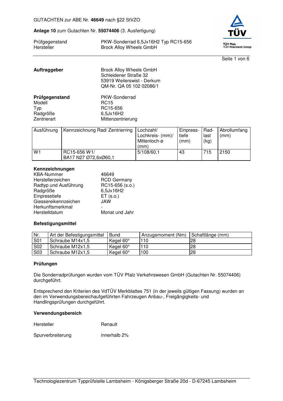 Dieses Gutachten (abe) bezieht sich auf die Alufelge Brock RC15-656 in der Ausführung 6.5Jx16 ET 0, Mittenloch 0 mm (KBA 46649). Im PDF findest du typischerweise zulässige Reifengrößen, Auflagen/Anbauhinweise und – je nach Dokument – Hinweise zur Eintragung.