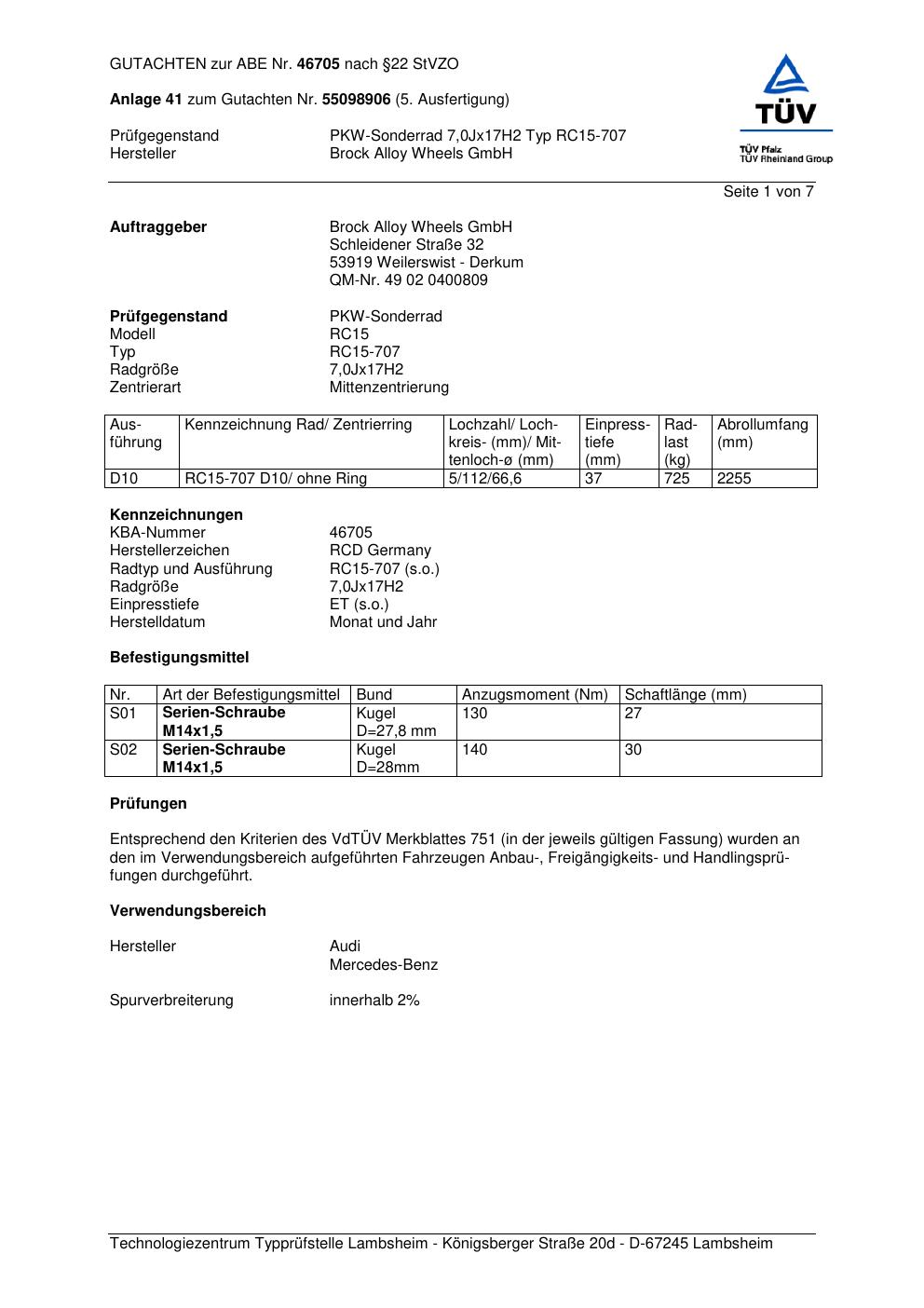 Dieses Gutachten (abe) bezieht sich auf die Alufelge Brock RC15-707 in der Ausführung 7Jx17 ET 0, Mittenloch 0 mm (KBA 46705). Im PDF findest du typischerweise zulässige Reifengrößen, Auflagen/Anbauhinweise und – je nach Dokument – Hinweise zur Eintragung.