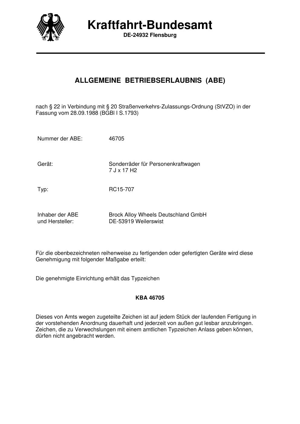 Dieses Gutachten (abe) bezieht sich auf die Alufelge Brock RC15-707 in der Ausführung 7Jx17 ET 0, Mittenloch 0 mm (KBA 46705). Im PDF findest du typischerweise zulässige Reifengrößen, Auflagen/Anbauhinweise und – je nach Dokument – Hinweise zur Eintragung.