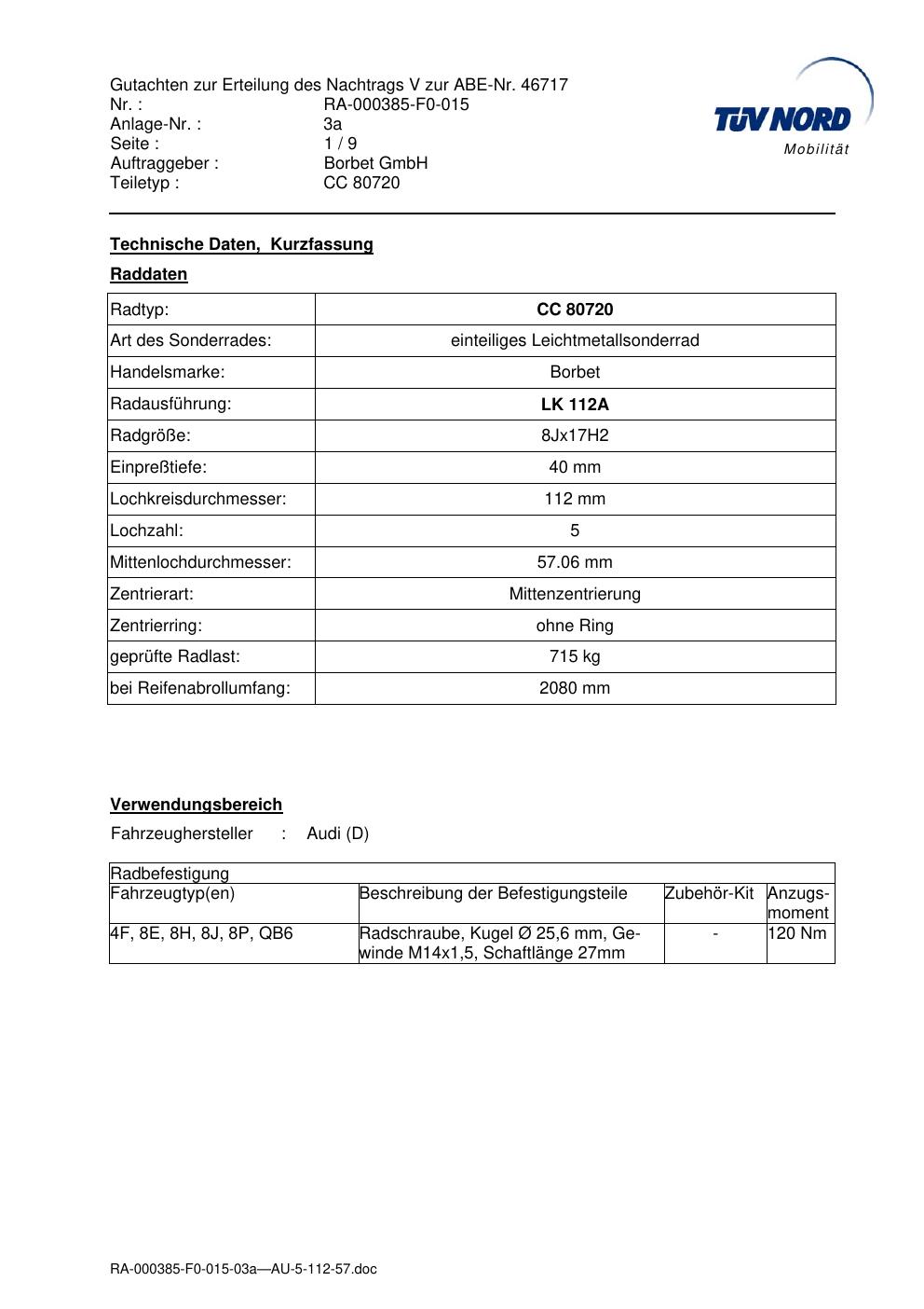 Dieses Gutachten (abe) bezieht sich auf die Alufelge brand-borbet CC 80720 in der Ausführung 8Jx17 ET 0, Mittenloch 0 mm (KBA 46717). Im PDF findest du typischerweise zulässige Reifengrößen, Auflagen/Anbauhinweise und – je nach Dokument – Hinweise zur Eintragung.