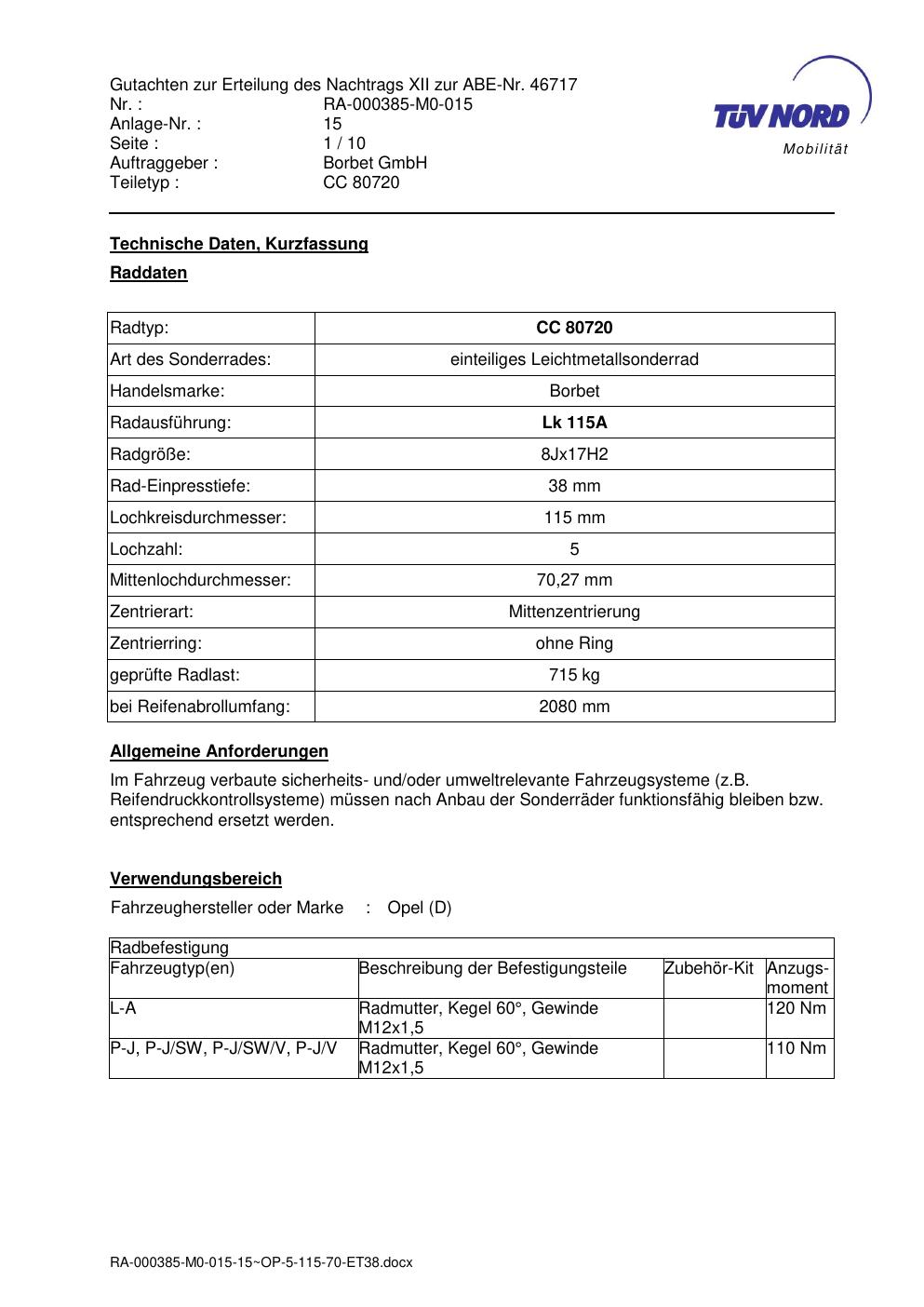 Dieses Gutachten (abe) bezieht sich auf die Alufelge brand-borbet CC 80720 in der Ausführung 8Jx17 ET 0, Mittenloch 0 mm (KBA 46717). Im PDF findest du typischerweise zulässige Reifengrößen, Auflagen/Anbauhinweise und – je nach Dokument – Hinweise zur Eintragung.