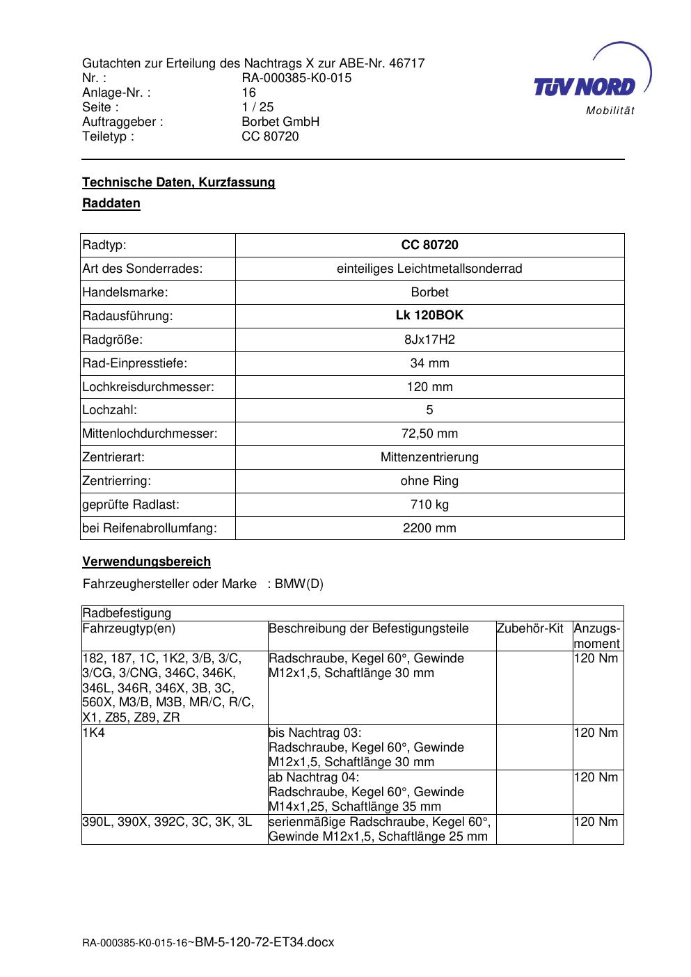 Dieses Gutachten (abe) bezieht sich auf die Alufelge Borbet CC 80720 in der Ausführung 8Jx17 ET 0, Mittenloch 0 mm (KBA 46717). Im PDF findest du typischerweise zulässige Reifengrößen, Auflagen/Anbauhinweise und – je nach Dokument – Hinweise zur Eintragung.