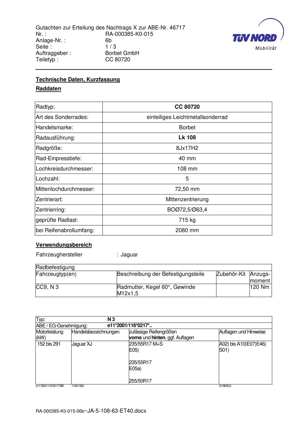 Dieses Gutachten (abe) bezieht sich auf die Alufelge brand-borbet CC 80720 in der Ausführung 8Jx17 ET 0, Mittenloch 0 mm (KBA 46717). Im PDF findest du typischerweise zulässige Reifengrößen, Auflagen/Anbauhinweise und – je nach Dokument – Hinweise zur Eintragung.