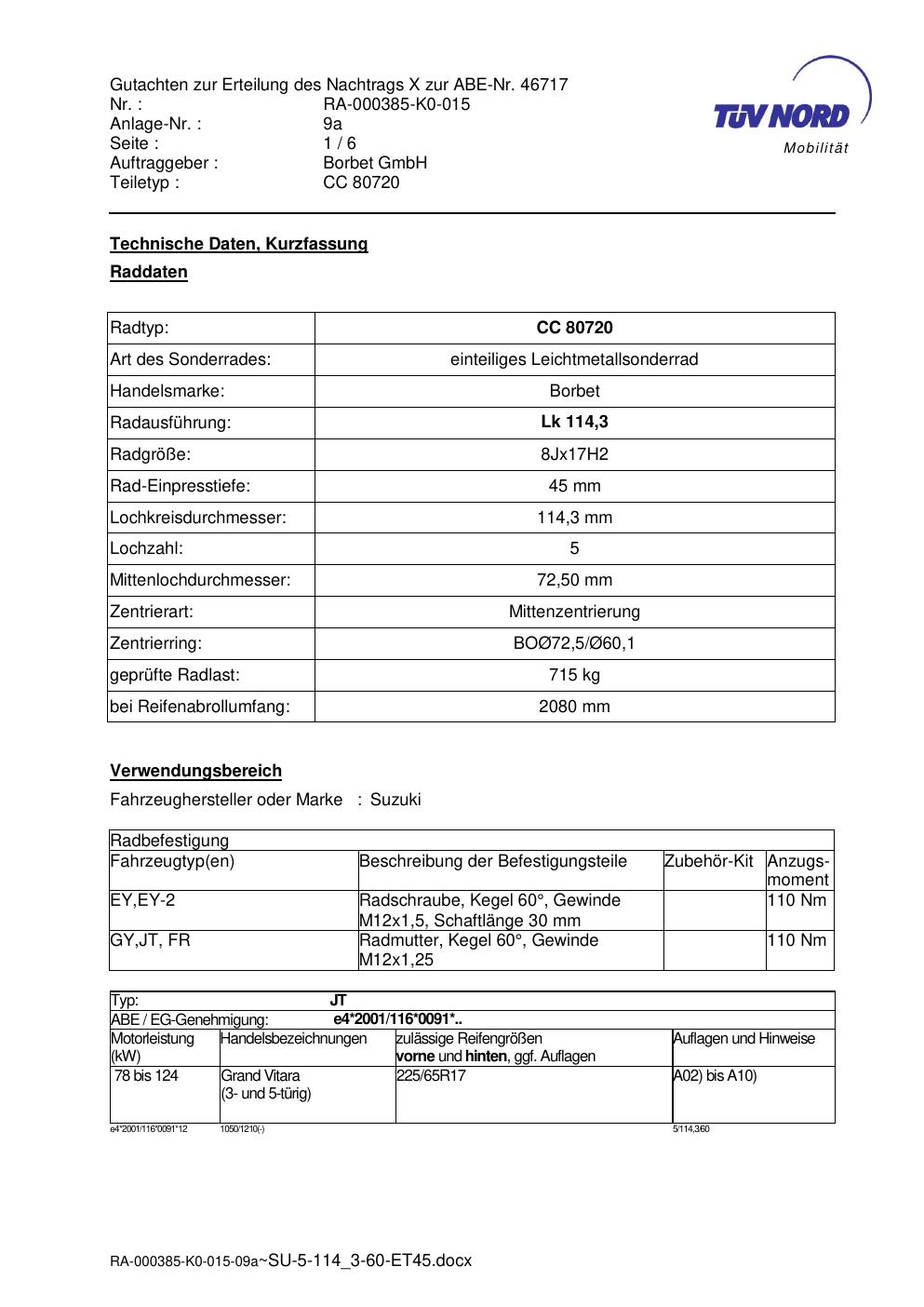 Dieses Gutachten (abe) bezieht sich auf die Alufelge brand-borbet CC 80720 in der Ausführung 8Jx17 ET 0, Mittenloch 0 mm (KBA 46717). Im PDF findest du typischerweise zulässige Reifengrößen, Auflagen/Anbauhinweise und – je nach Dokument – Hinweise zur Eintragung.