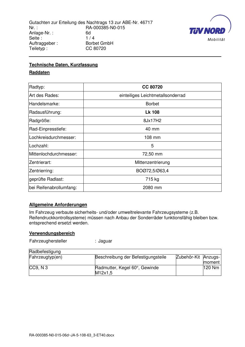 Dieses Gutachten (abe) bezieht sich auf die Alufelge brand-borbet CC 80720 in der Ausführung 8Jx17 ET 0, Mittenloch 0 mm (KBA 46717). Im PDF findest du typischerweise zulässige Reifengrößen, Auflagen/Anbauhinweise und – je nach Dokument – Hinweise zur Eintragung.
