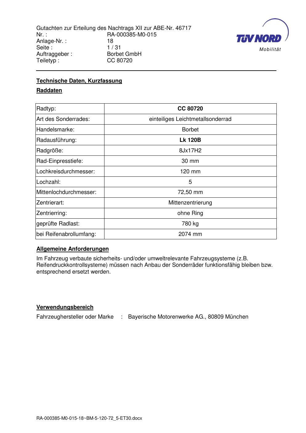 Dieses Gutachten (abe) bezieht sich auf die Alufelge brand-borbet CC 80720 in der Ausführung 8Jx17 ET 0, Mittenloch 0 mm (KBA 46717). Im PDF findest du typischerweise zulässige Reifengrößen, Auflagen/Anbauhinweise und – je nach Dokument – Hinweise zur Eintragung.