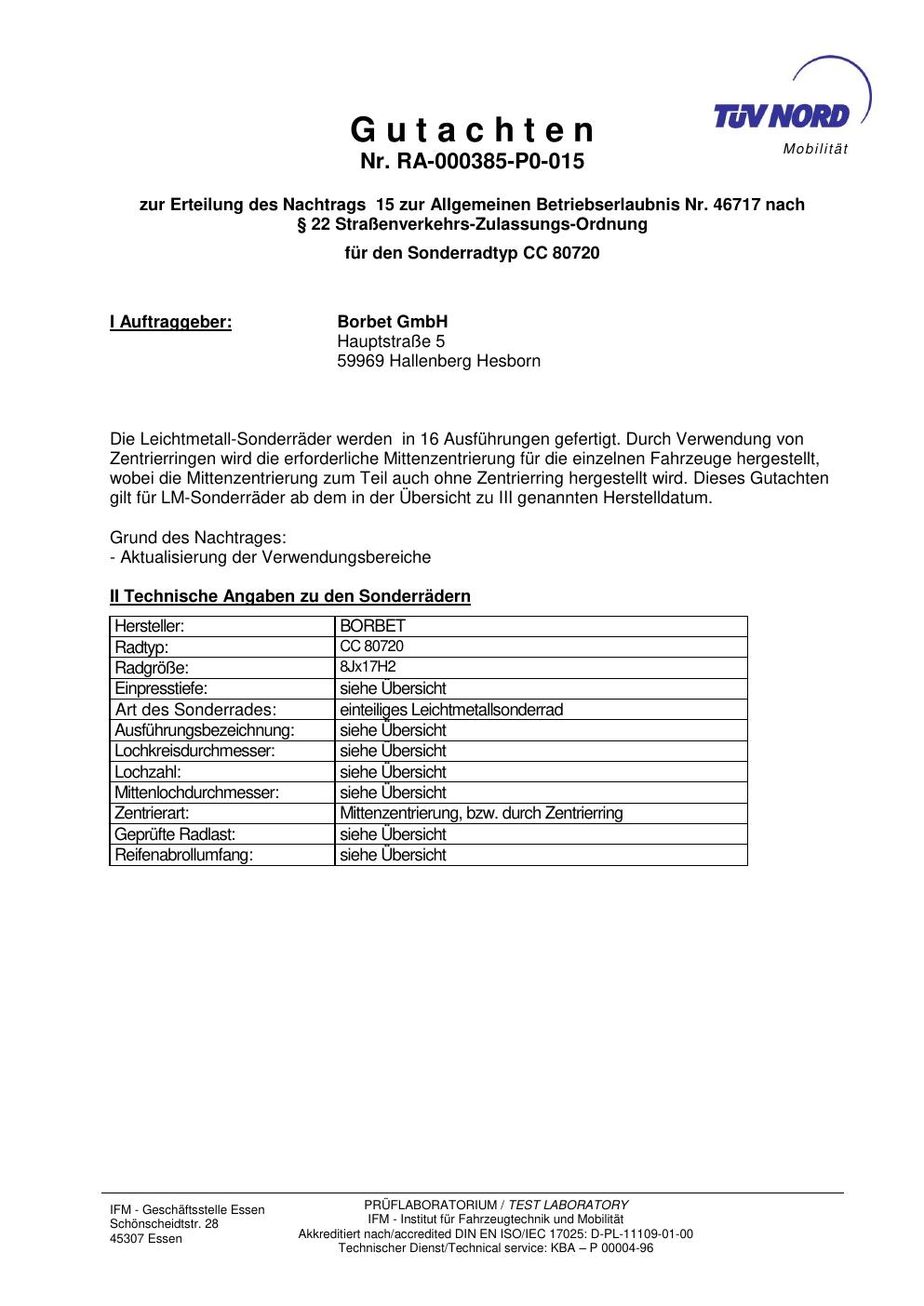 Dieses Gutachten (abe) bezieht sich auf die Alufelge Borbet CC 80720 in der Ausführung 8Jx17 ET 0, Mittenloch 0 mm (KBA 46717). Im PDF findest du typischerweise zulässige Reifengrößen, Auflagen/Anbauhinweise und – je nach Dokument – Hinweise zur Eintragung.