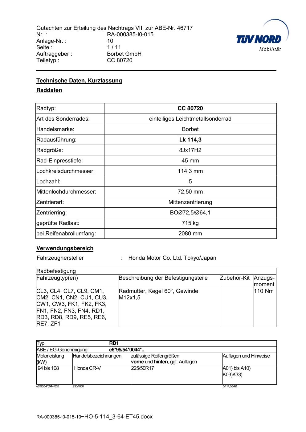 Dieses Gutachten (abe) bezieht sich auf die Alufelge brand-borbet CC 80720 in der Ausführung 8Jx17 ET 0, Mittenloch 0 mm (KBA 46717). Im PDF findest du typischerweise zulässige Reifengrößen, Auflagen/Anbauhinweise und – je nach Dokument – Hinweise zur Eintragung.