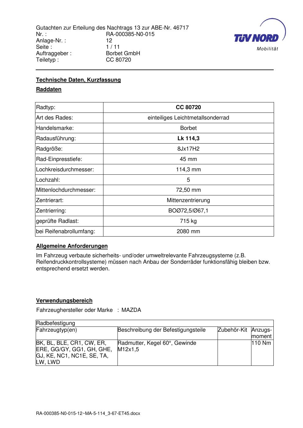 Dieses Gutachten (abe) bezieht sich auf die Alufelge brand-borbet CC 80720 in der Ausführung 8Jx17 ET 0, Mittenloch 0 mm (KBA 46717). Im PDF findest du typischerweise zulässige Reifengrößen, Auflagen/Anbauhinweise und – je nach Dokument – Hinweise zur Eintragung.
