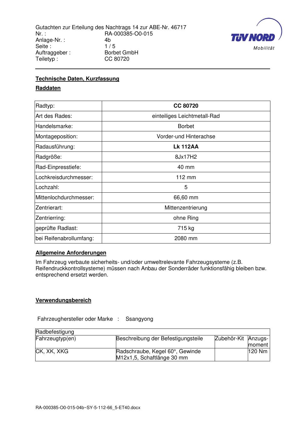 Dieses Gutachten (abe) bezieht sich auf die Alufelge brand-borbet CC 80720 in der Ausführung 8Jx17 ET 0, Mittenloch 0 mm (KBA 46717). Im PDF findest du typischerweise zulässige Reifengrößen, Auflagen/Anbauhinweise und – je nach Dokument – Hinweise zur Eintragung.