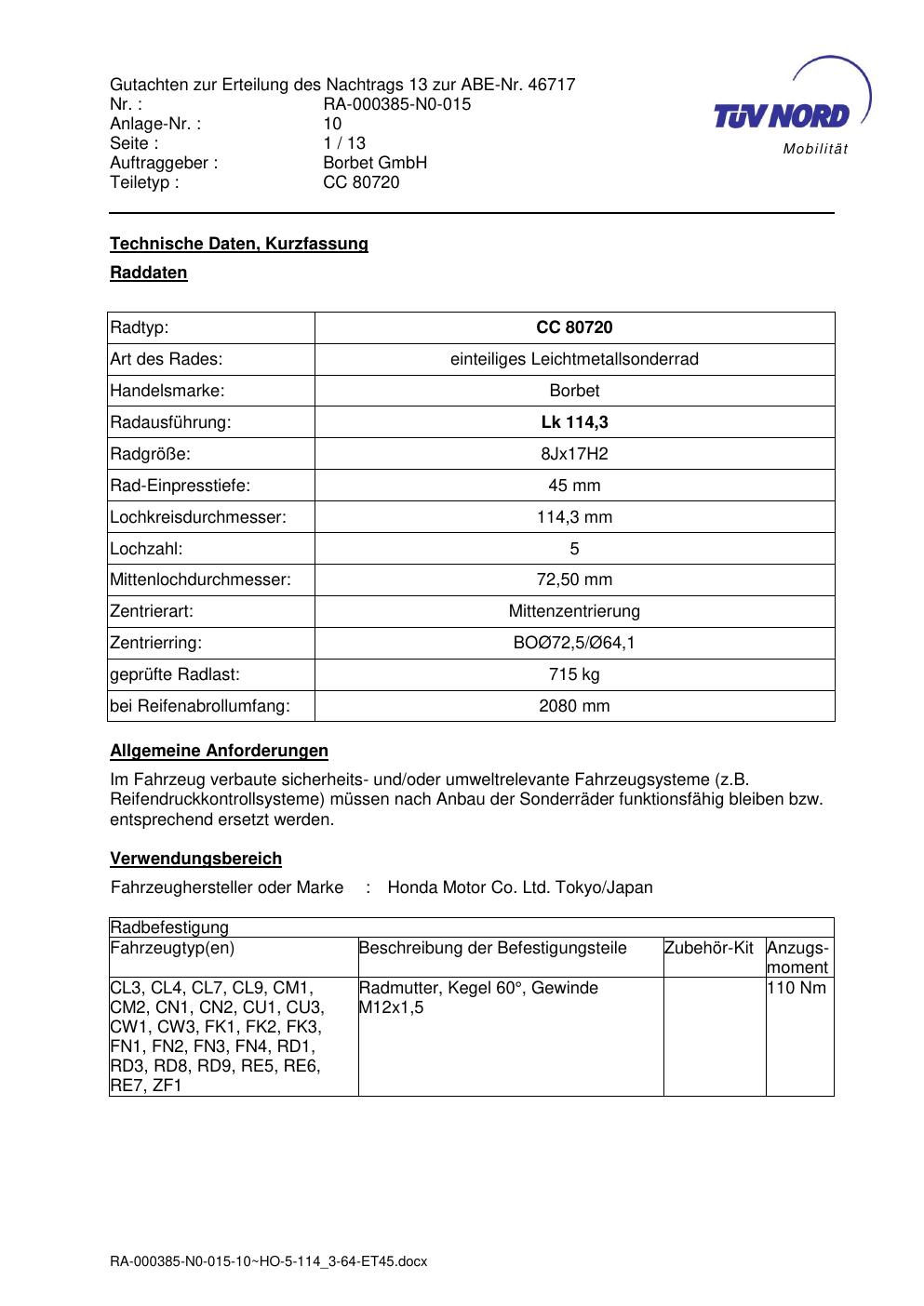 Dieses Gutachten (abe) bezieht sich auf die Alufelge Borbet CC 80720 in der Ausführung 8Jx17 ET 0, Mittenloch 0 mm (KBA 46717). Im PDF findest du typischerweise zulässige Reifengrößen, Auflagen/Anbauhinweise und – je nach Dokument – Hinweise zur Eintragung.