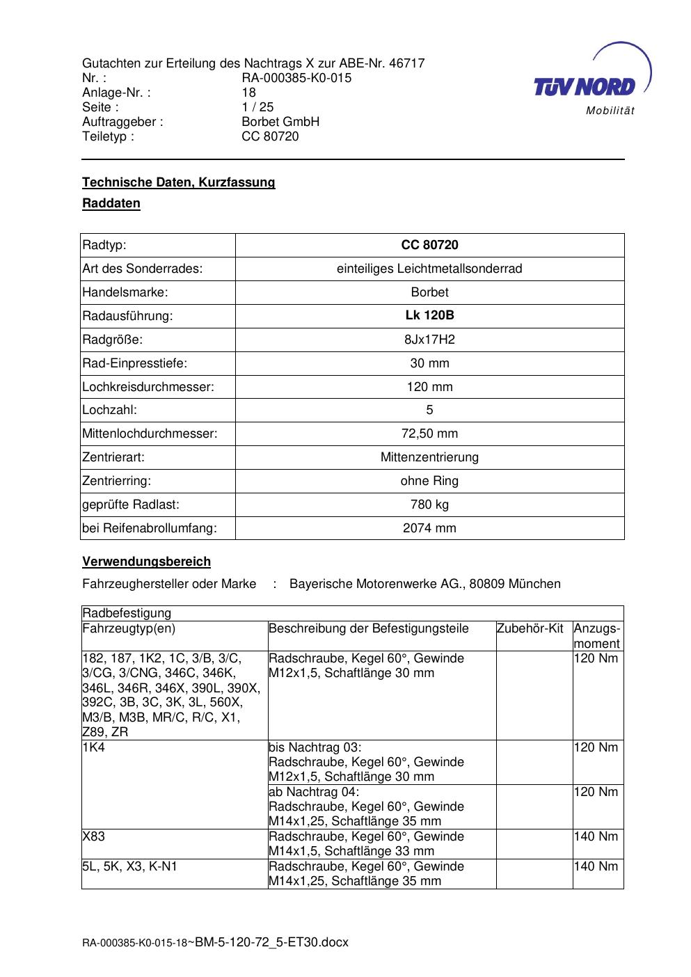 Dieses Gutachten (abe) bezieht sich auf die Alufelge brand-borbet CC 80720 in der Ausführung 8Jx17 ET 0, Mittenloch 0 mm (KBA 46717). Im PDF findest du typischerweise zulässige Reifengrößen, Auflagen/Anbauhinweise und – je nach Dokument – Hinweise zur Eintragung.