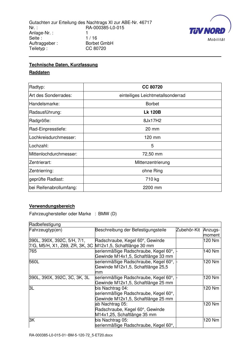 Dieses Gutachten (abe) bezieht sich auf die Alufelge Borbet CC 80720 in der Ausführung 8Jx17 ET 0, Mittenloch 0 mm (KBA 46717). Im PDF findest du typischerweise zulässige Reifengrößen, Auflagen/Anbauhinweise und – je nach Dokument – Hinweise zur Eintragung.