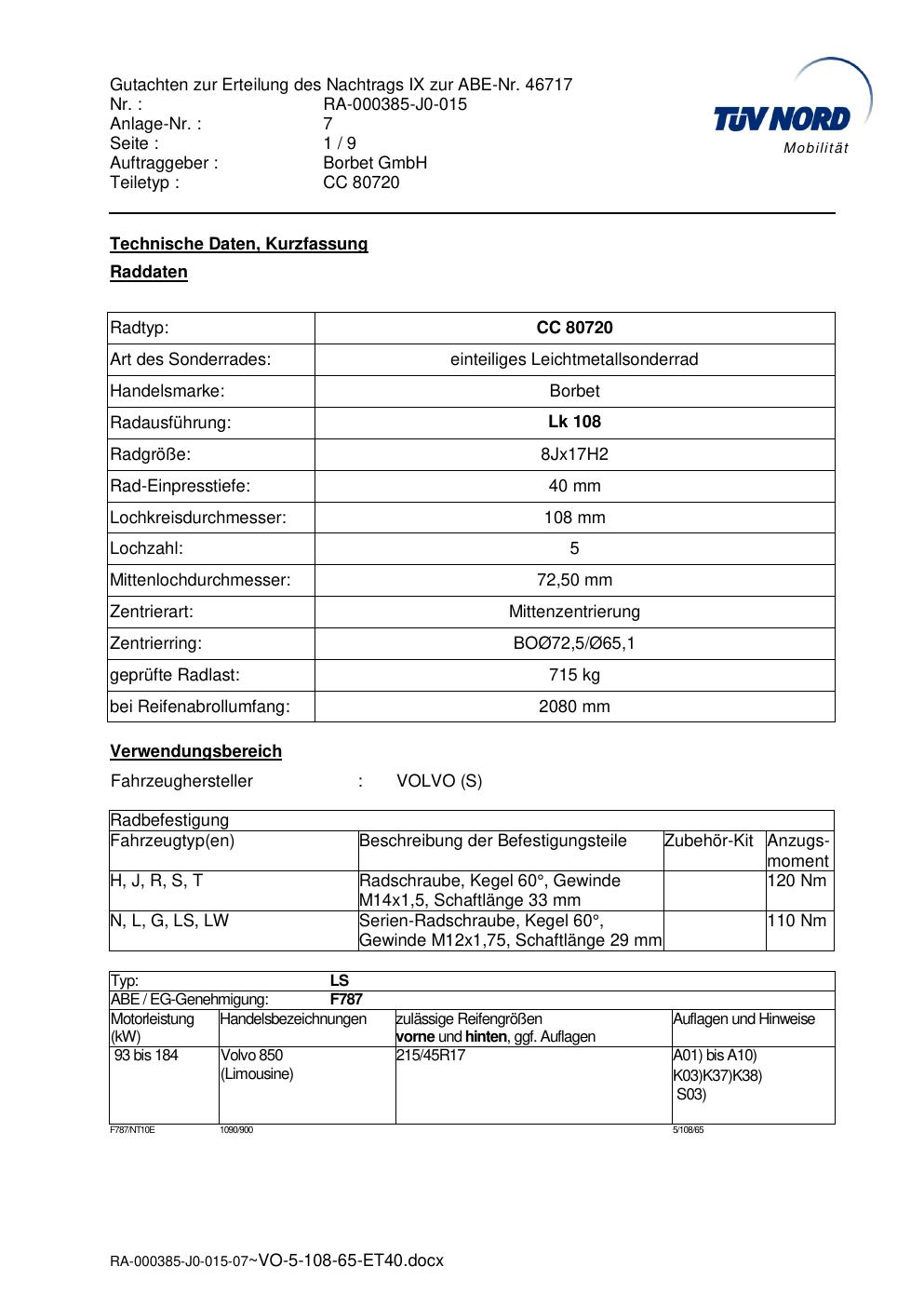 Dieses Gutachten (abe) bezieht sich auf die Alufelge brand-borbet CC 80720 in der Ausführung 8Jx17 ET 0, Mittenloch 0 mm (KBA 46717). Im PDF findest du typischerweise zulässige Reifengrößen, Auflagen/Anbauhinweise und – je nach Dokument – Hinweise zur Eintragung.