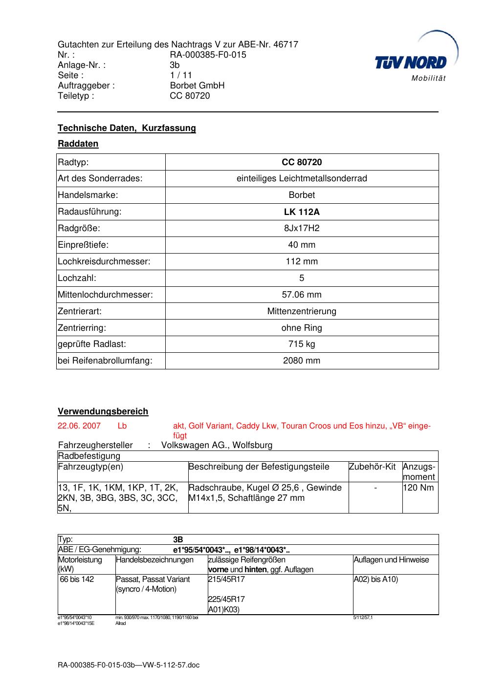 Dieses Gutachten (abe) bezieht sich auf die Alufelge brand-borbet CC 80720 in der Ausführung 8Jx17 ET 0, Mittenloch 0 mm (KBA 46717). Im PDF findest du typischerweise zulässige Reifengrößen, Auflagen/Anbauhinweise und – je nach Dokument – Hinweise zur Eintragung.