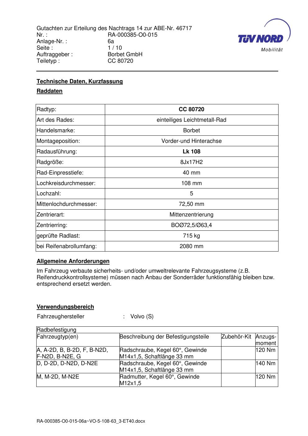 Dieses Gutachten (abe) bezieht sich auf die Alufelge brand-borbet CC 80720 in der Ausführung 8Jx17 ET 0, Mittenloch 0 mm (KBA 46717). Im PDF findest du typischerweise zulässige Reifengrößen, Auflagen/Anbauhinweise und – je nach Dokument – Hinweise zur Eintragung.