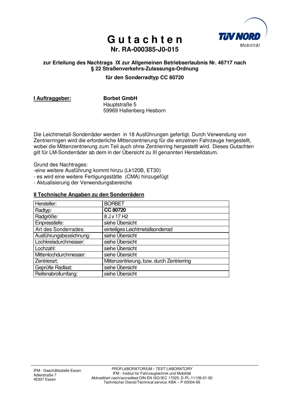 Dieses Gutachten (abe) bezieht sich auf die Alufelge Borbet CC 80720 in der Ausführung 8Jx17 ET 0, Mittenloch 0 mm (KBA 46717). Im PDF findest du typischerweise zulässige Reifengrößen, Auflagen/Anbauhinweise und – je nach Dokument – Hinweise zur Eintragung.