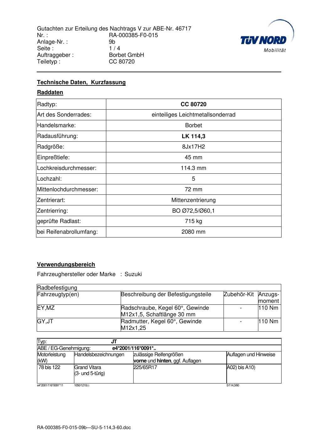 Dieses Gutachten (abe) bezieht sich auf die Alufelge brand-borbet CC 80720 in der Ausführung 8Jx17 ET 0, Mittenloch 0 mm (KBA 46717). Im PDF findest du typischerweise zulässige Reifengrößen, Auflagen/Anbauhinweise und – je nach Dokument – Hinweise zur Eintragung.