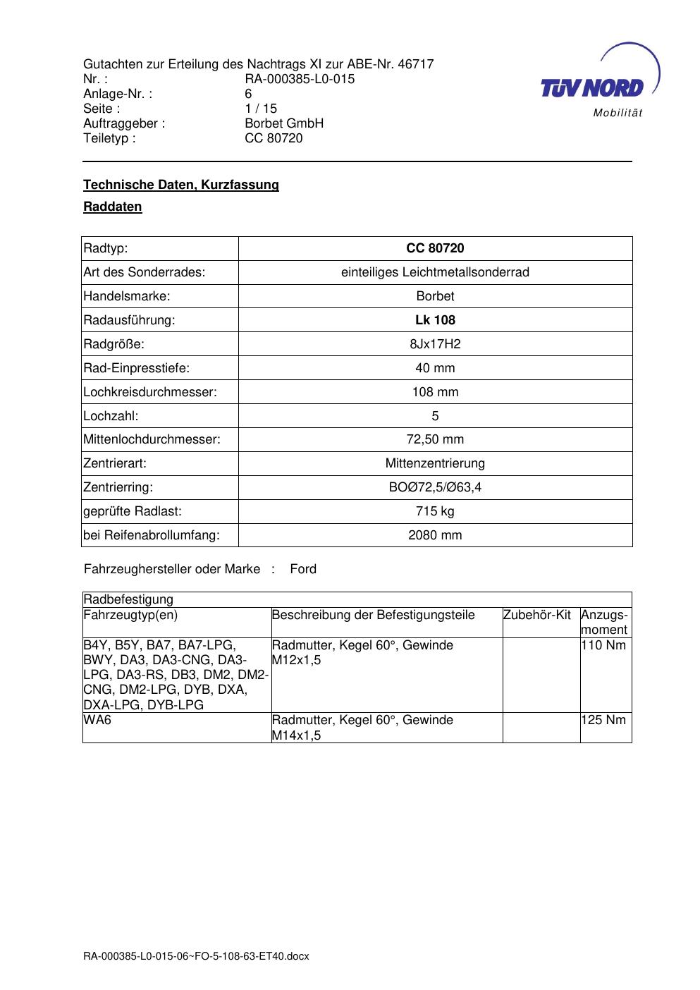 Dieses Gutachten (abe) bezieht sich auf die Alufelge brand-borbet CC 80720 in der Ausführung 8Jx17 ET 0, Mittenloch 0 mm (KBA 46717). Im PDF findest du typischerweise zulässige Reifengrößen, Auflagen/Anbauhinweise und – je nach Dokument – Hinweise zur Eintragung.