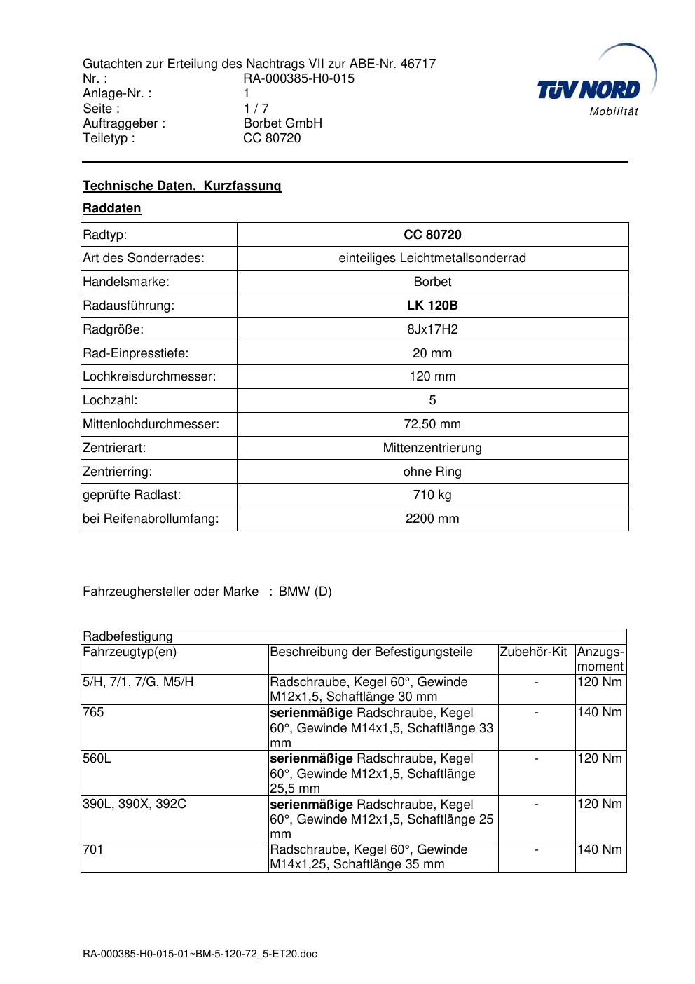 Dieses Gutachten (abe) bezieht sich auf die Alufelge brand-borbet CC 80720 in der Ausführung 8Jx17 ET 0, Mittenloch 0 mm (KBA 46717). Im PDF findest du typischerweise zulässige Reifengrößen, Auflagen/Anbauhinweise und – je nach Dokument – Hinweise zur Eintragung.
