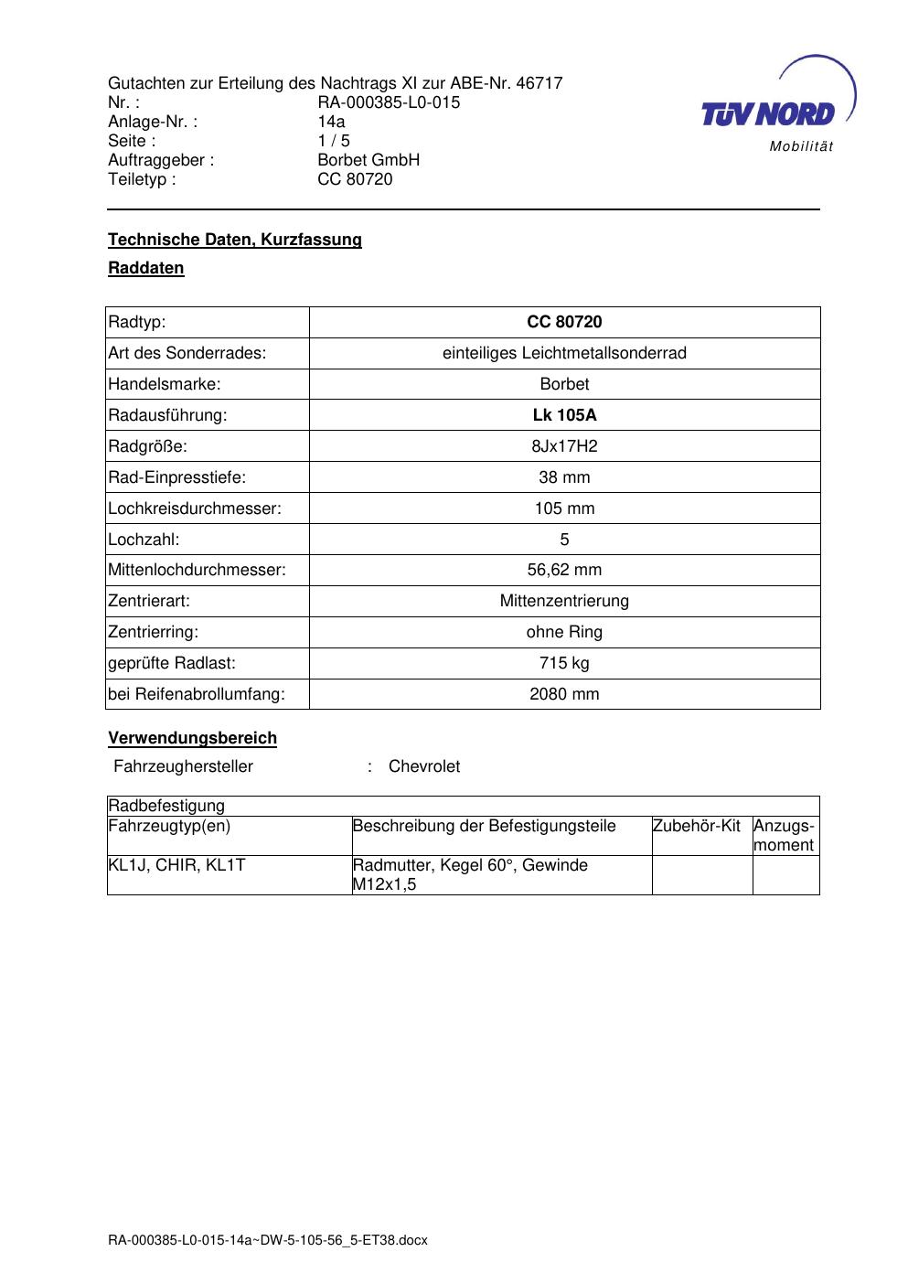 Dieses Gutachten (abe) bezieht sich auf die Alufelge brand-borbet CC 80720 in der Ausführung 8Jx17 ET 0, Mittenloch 0 mm (KBA 46717). Im PDF findest du typischerweise zulässige Reifengrößen, Auflagen/Anbauhinweise und – je nach Dokument – Hinweise zur Eintragung.