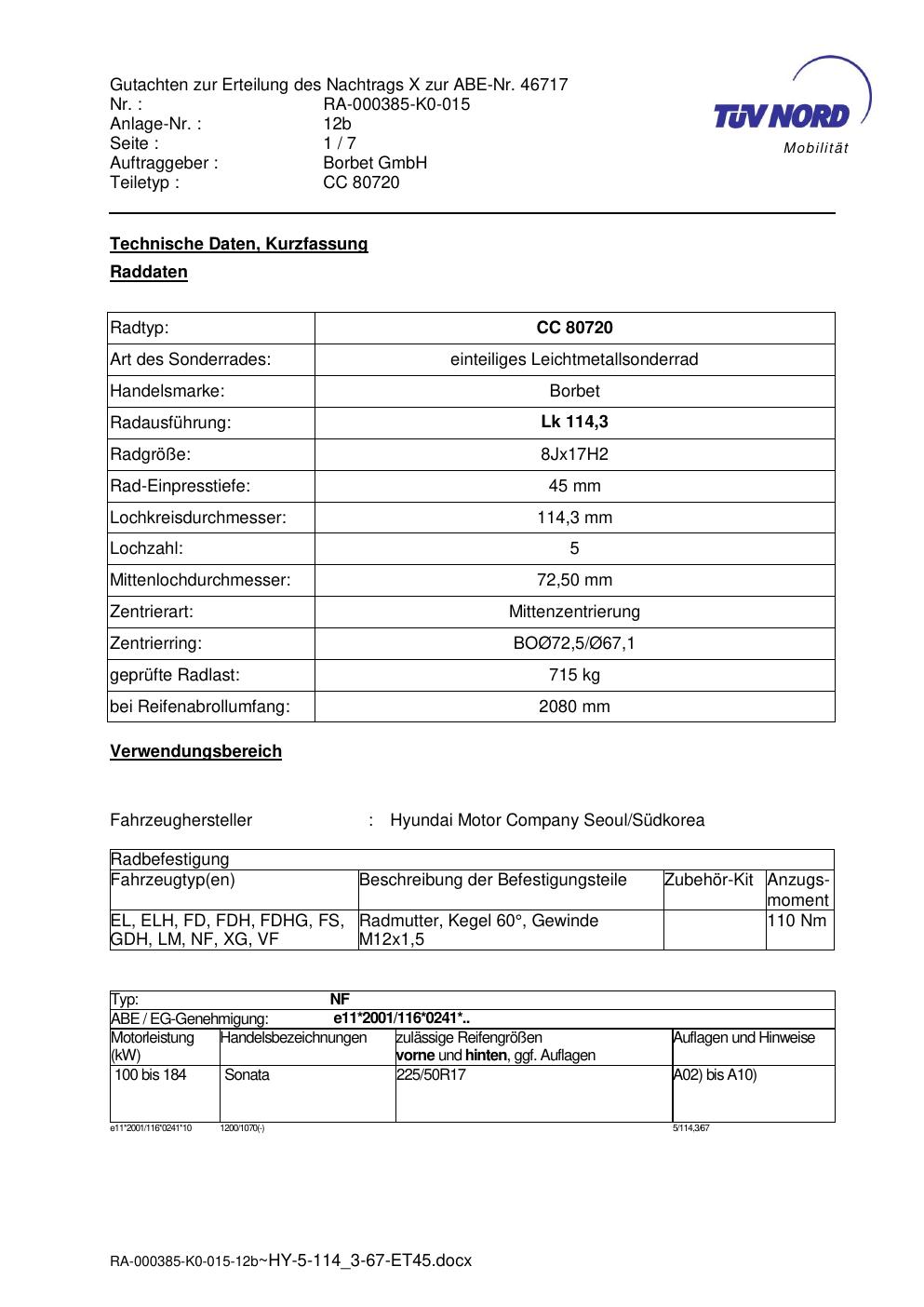 Dieses Gutachten (abe) bezieht sich auf die Alufelge brand-borbet CC 80720 in der Ausführung 8Jx17 ET 0, Mittenloch 0 mm (KBA 46717). Im PDF findest du typischerweise zulässige Reifengrößen, Auflagen/Anbauhinweise und – je nach Dokument – Hinweise zur Eintragung.