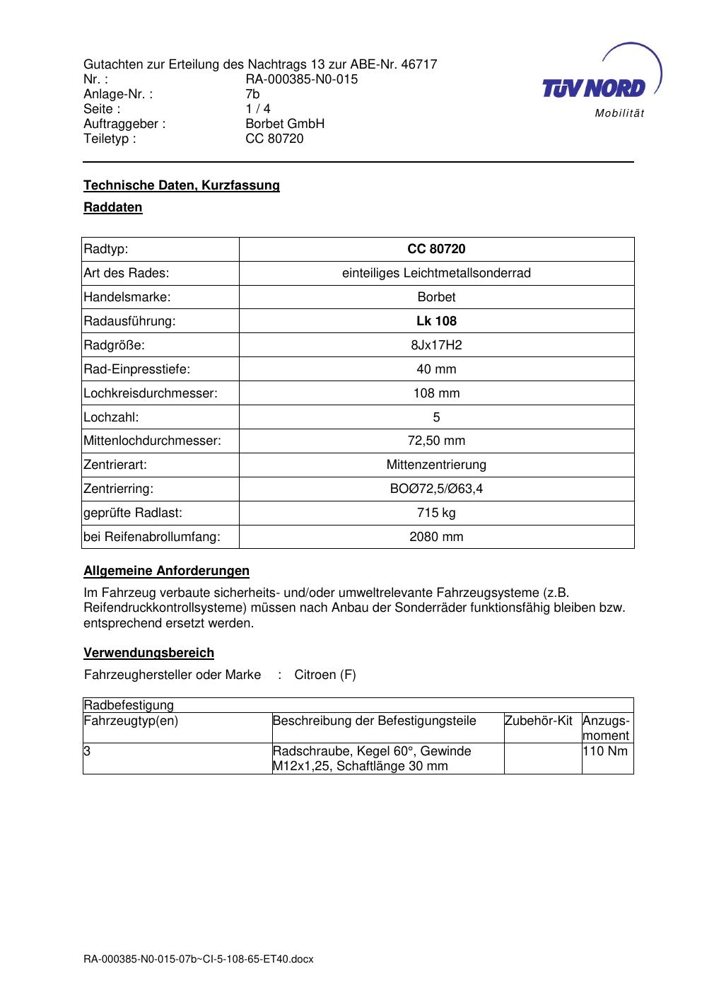 Dieses Gutachten (abe) bezieht sich auf die Alufelge brand-borbet CC 80720 in der Ausführung 8Jx17 ET 0, Mittenloch 0 mm (KBA 46717). Im PDF findest du typischerweise zulässige Reifengrößen, Auflagen/Anbauhinweise und – je nach Dokument – Hinweise zur Eintragung.